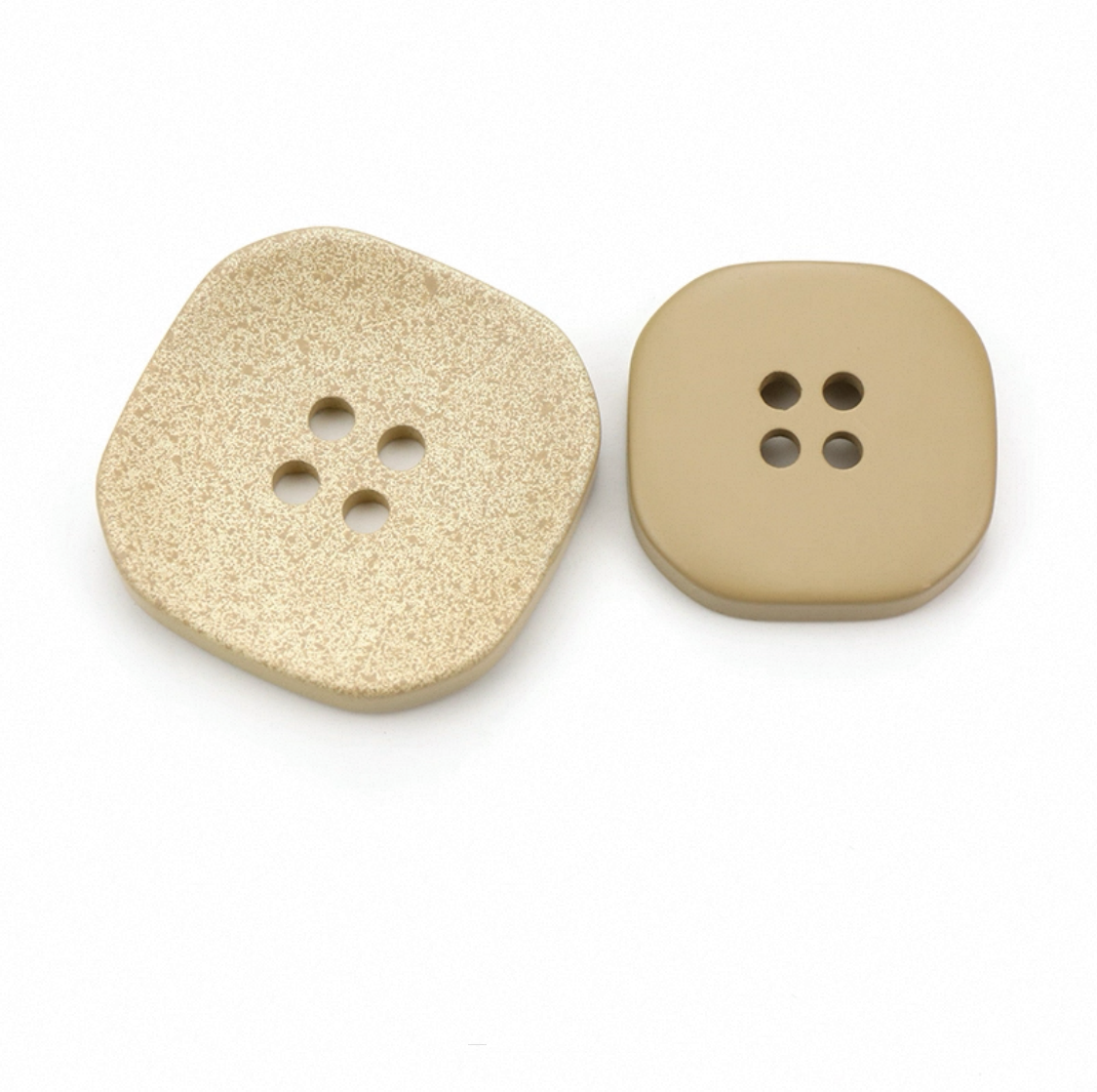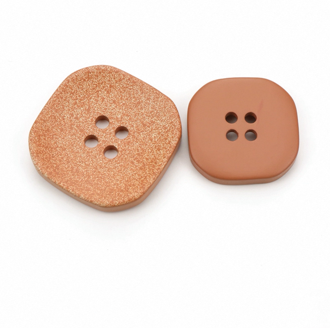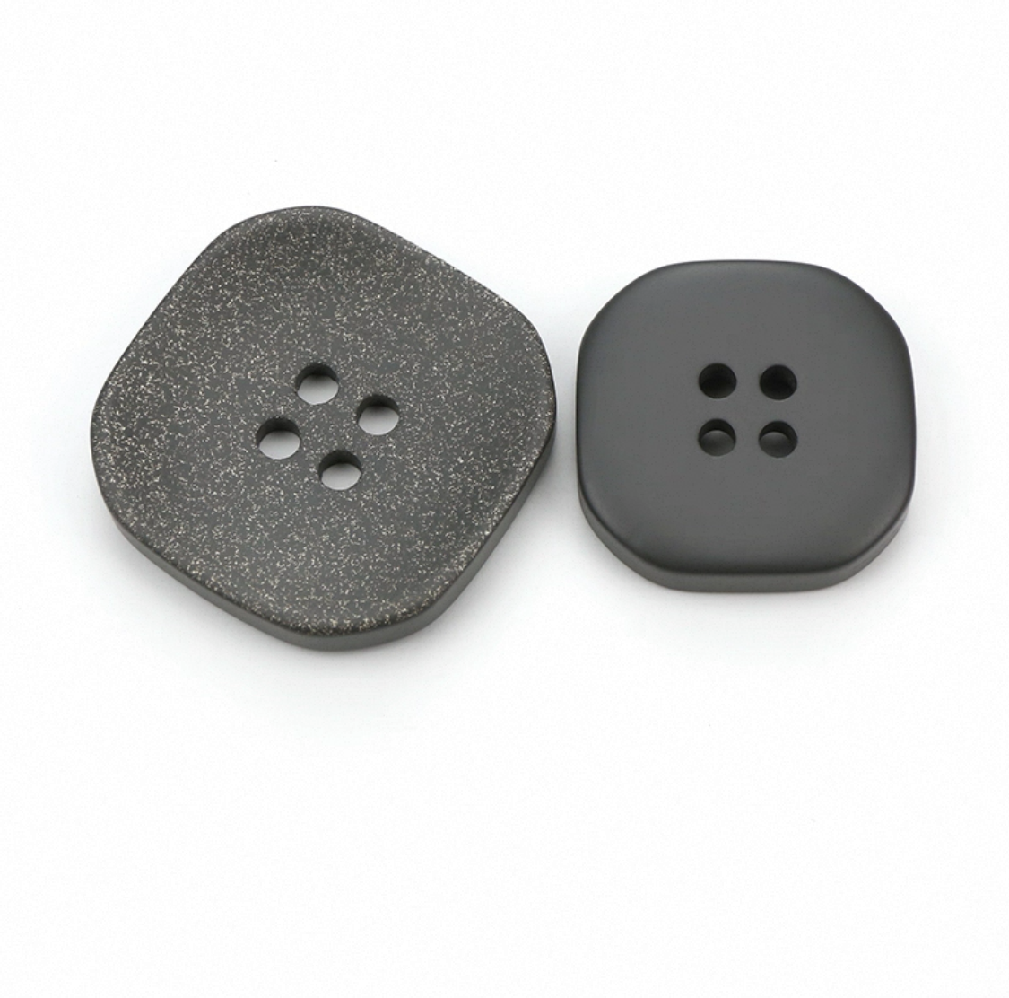 属性:这款四方形磨砂树脂钮扣,酷黑主调尽显低调质感。一面似洒落细碎星光,为衣物添一抹神秘灵动;一面简约纯粹,流露利落大气。四孔设计稳固实用,无论是商务正装还是休闲潮搭,它们都能精准拿捏风格,成为穿搭中的点睛之笔。