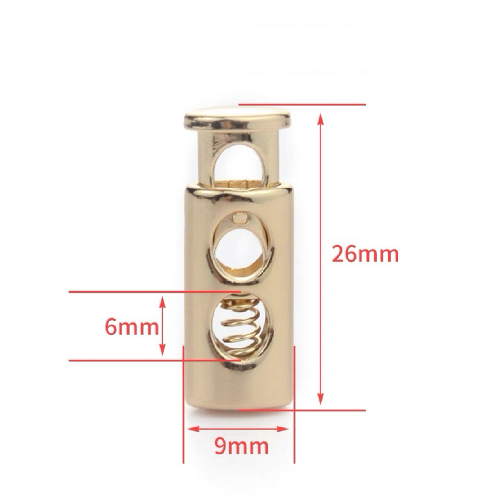 属性:精致金属弹簧扣,挂枪,挂酸金双色尺寸精准:高 26mm、宽 9mm,6mm 细节藏巧思。弹簧结构灵活,穿绳即用,轻松调节松紧,适配衣帽、箱包,为物件注入实用美学,小配件点亮大创意。