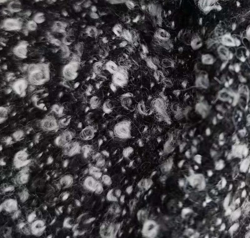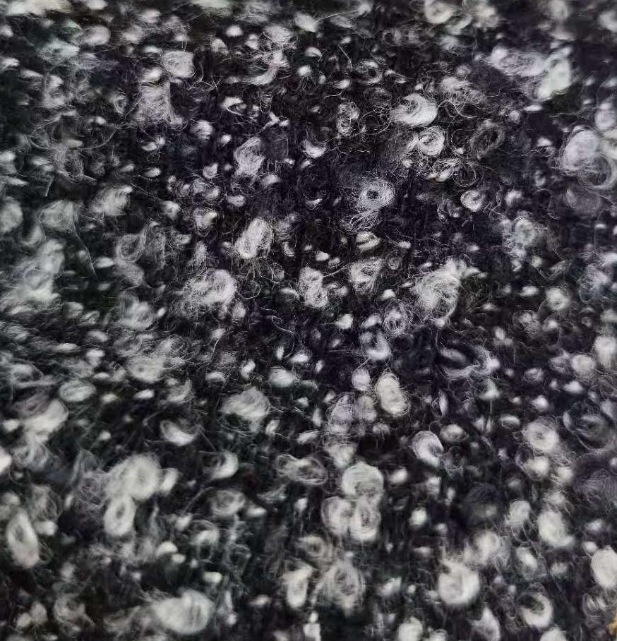 属性:羊毛赋予面料天然保暖性与柔软亲肤的触感,涤纶则增强面料挺括度与耐穿性,减少起球变形,兼顾天然质感与实用性能。黑灰撞色交织出立体饱满的圈圈肌理,自带复古慵懒氛围,视觉层次丰富且极具设计感。