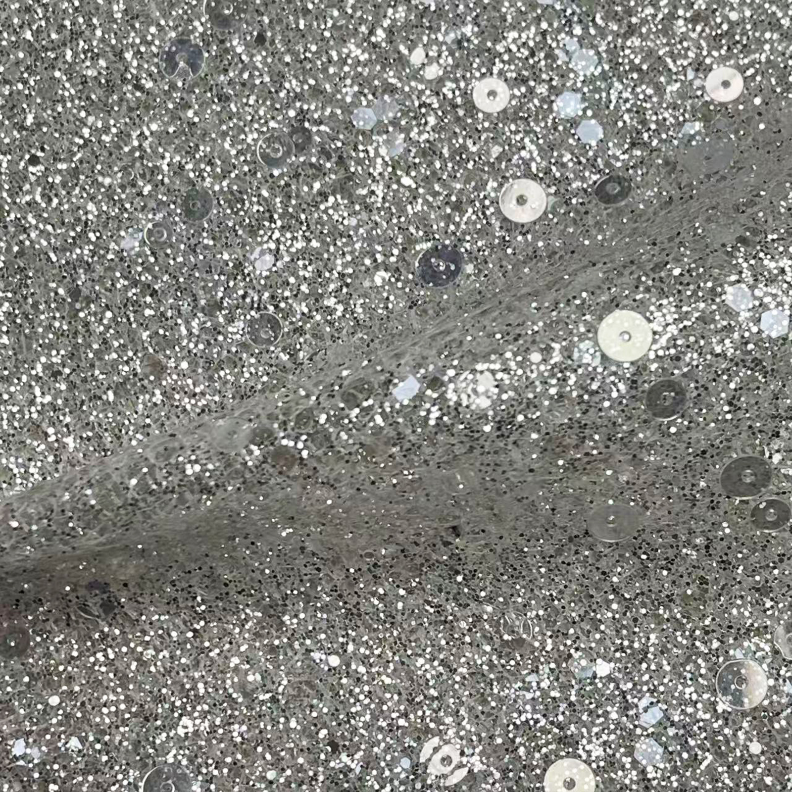 属性:质地偏硬挺、大网洞设计搭配蕾丝肌理,镶嵌银闪亮片层次感拉满。华丽又具通透感,适配舞台造型与礼服装饰。