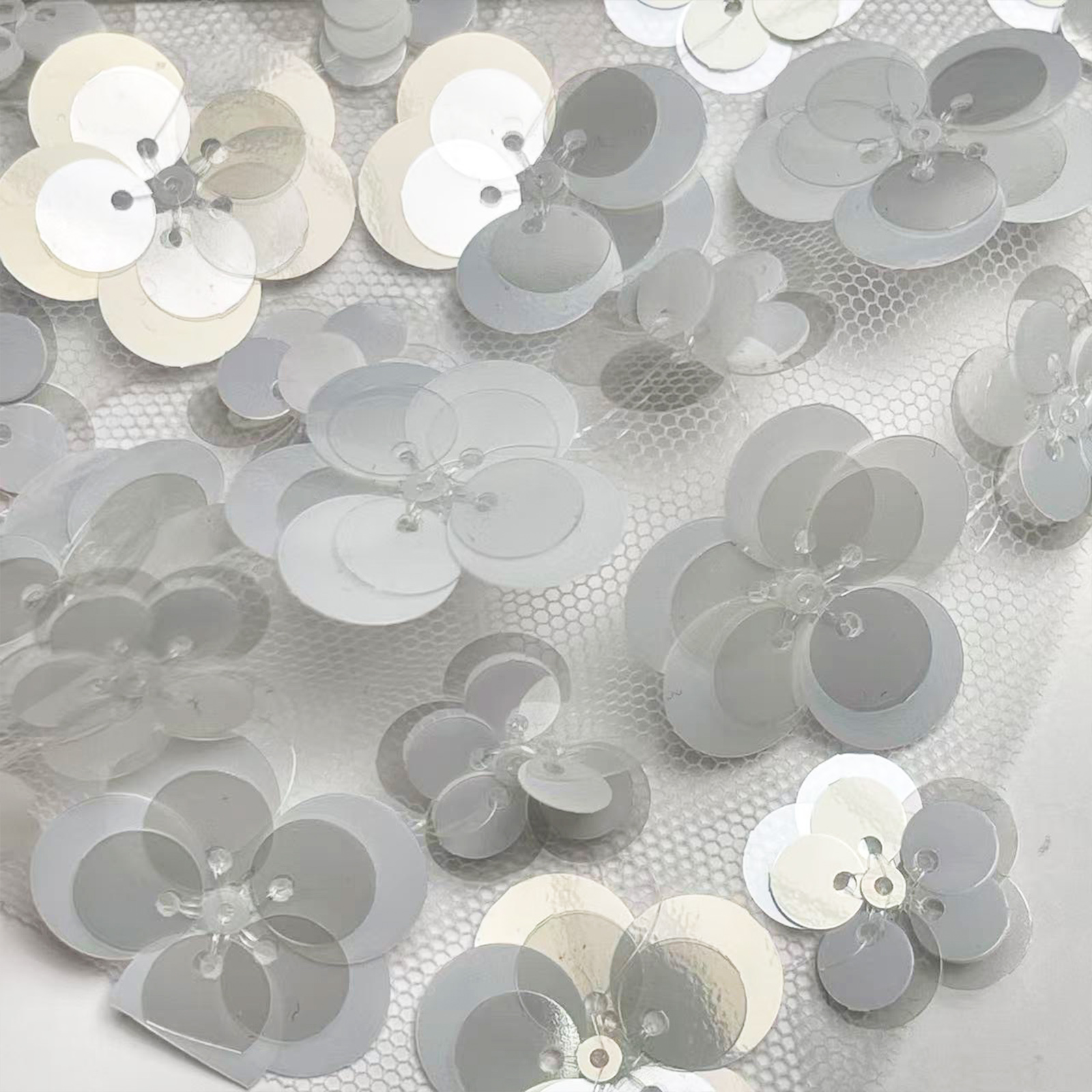 属性:柔透网纱为基底,缀满大尺寸圆亮片,交织绒感花骨朵肌理。触感轻盈蓬松,网眼通透透气,珠片与花型错落有致,光泽灵动闪耀。