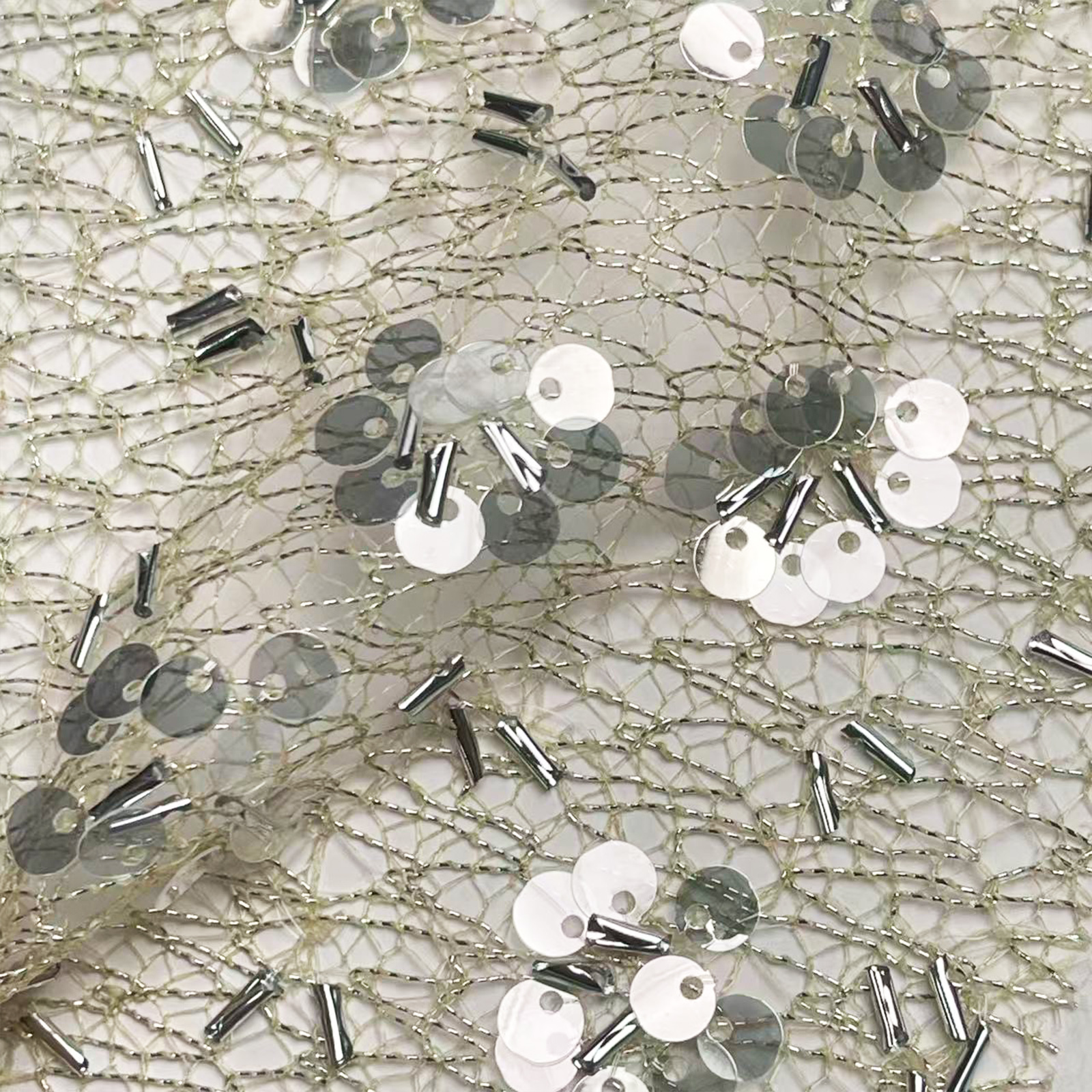 属性:大网眼纱为基底,搭配管珠、亮片与银线交织工艺,立体缀饰饱满亮眼。面料轻盈通透,透气性佳,银线流光点缀,珠饰排布规整牢固。