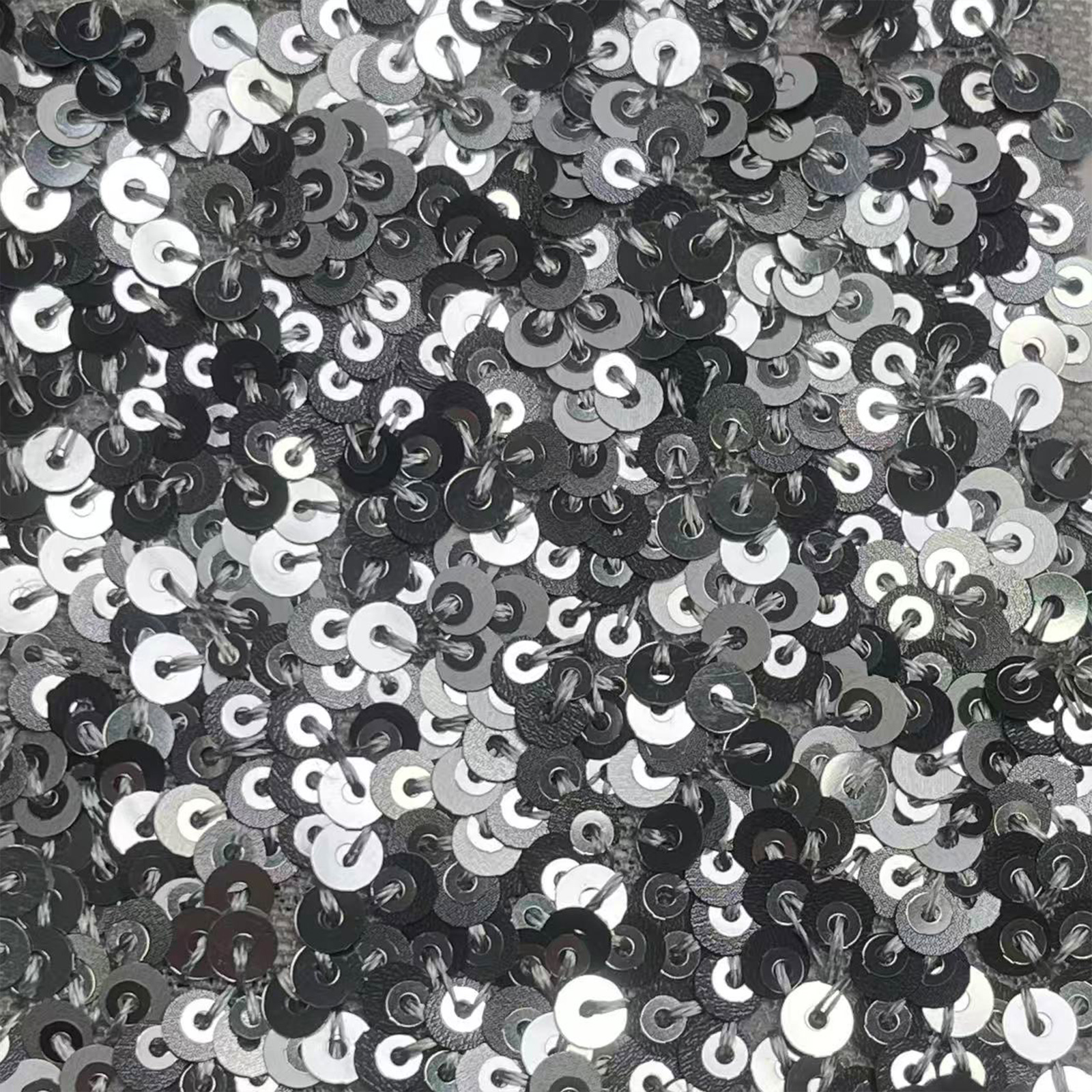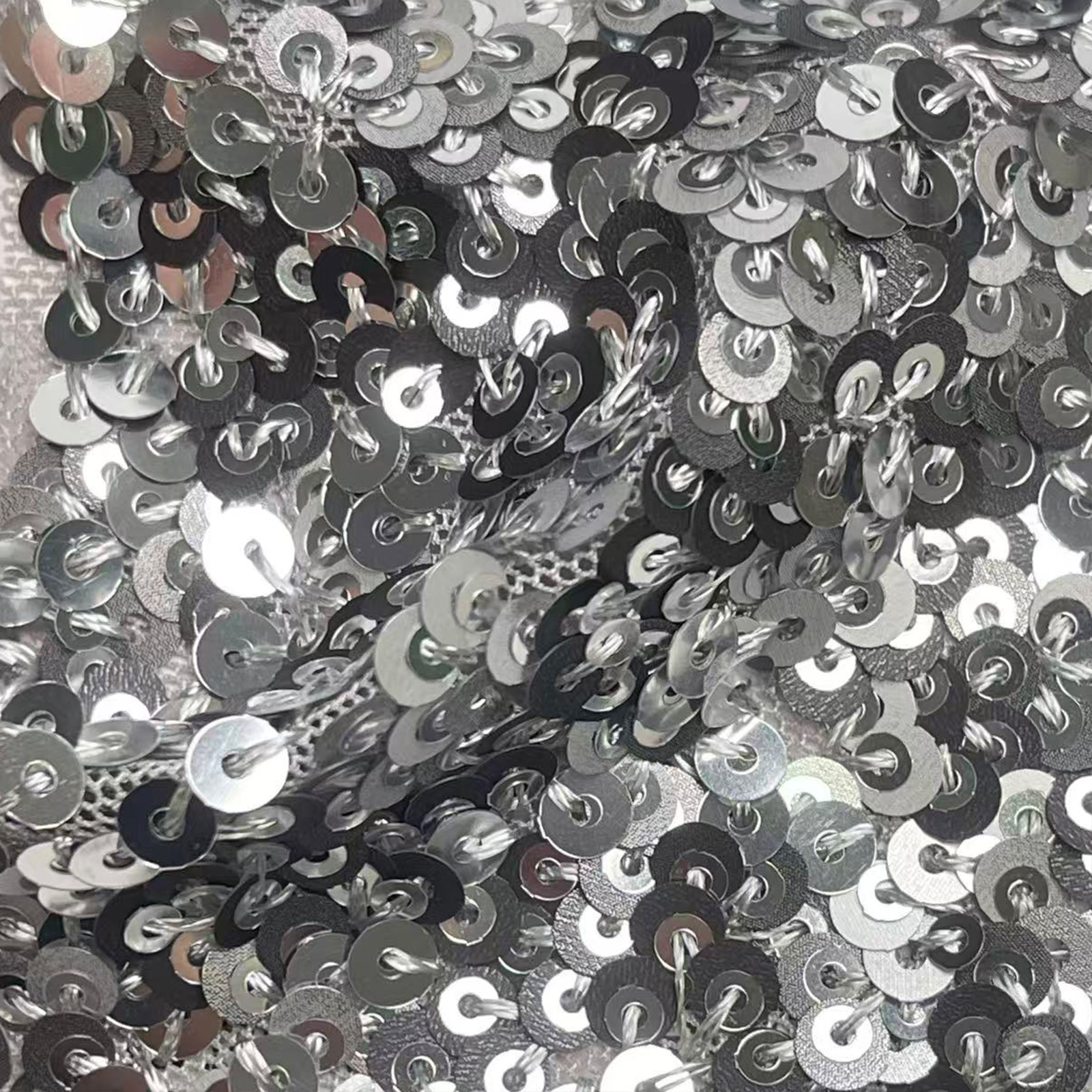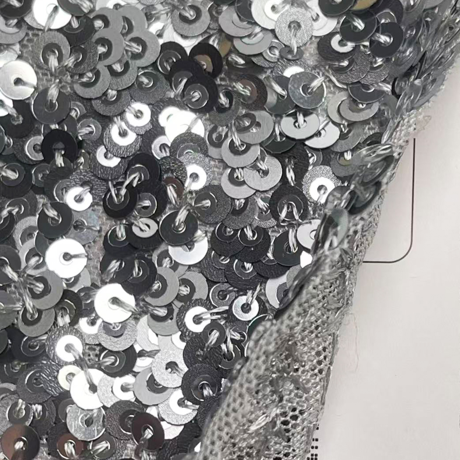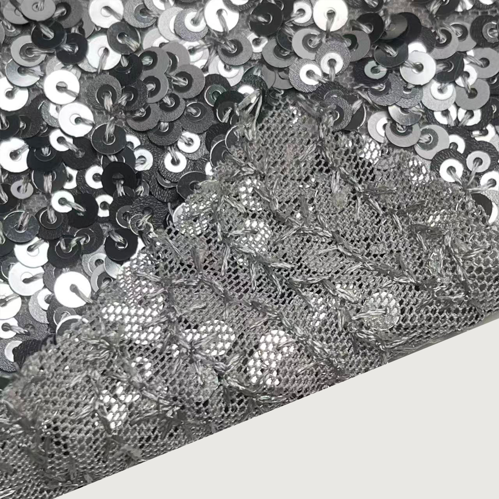 属性:以高弹网布为基底,采用珠片绣工艺缀满亮片,兼具弹性与垂坠感。面料柔软亲肤,拉伸回弹性能优异,透气不闷身,珠片排布规整且牢固。