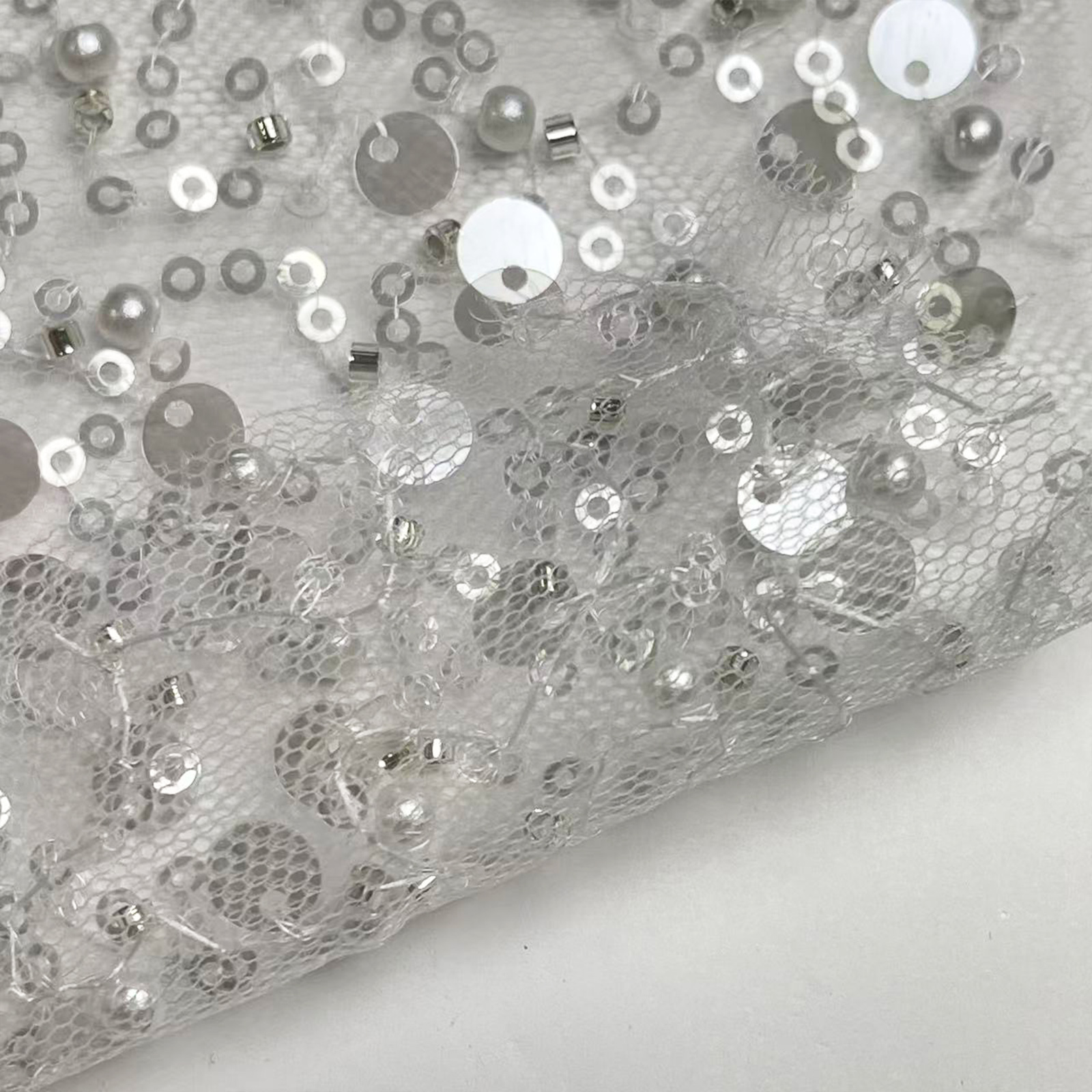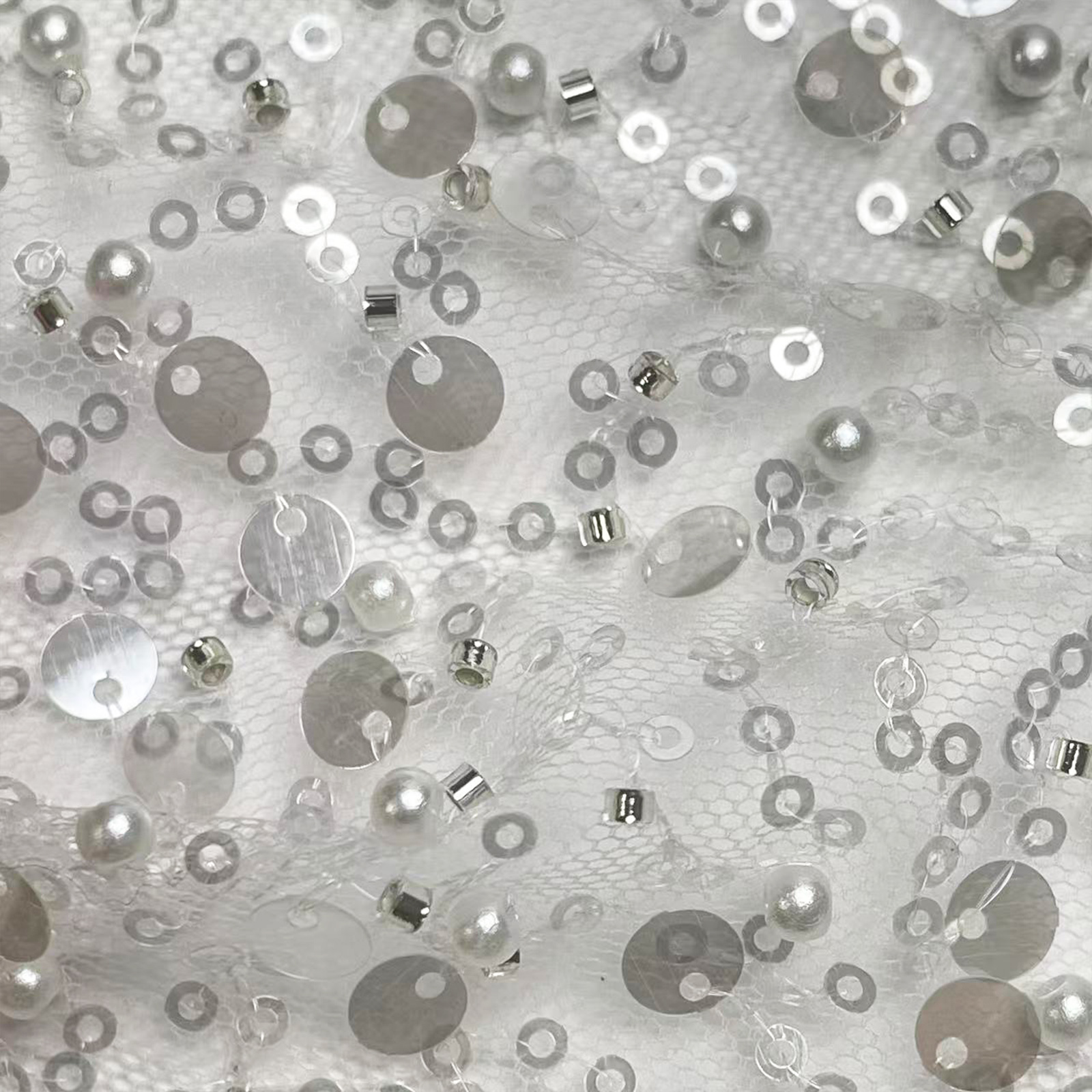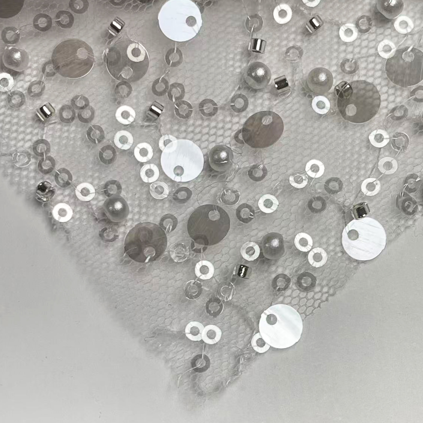 属性:通透网纱为基底,融合珍珠、管珠与大小亮片多重缀饰,肌理层次丰富。网纱轻盈透气,珠饰与亮片排布错落有致,牢固不易脱落。光泽温润与闪耀并存,视觉饱满华丽。