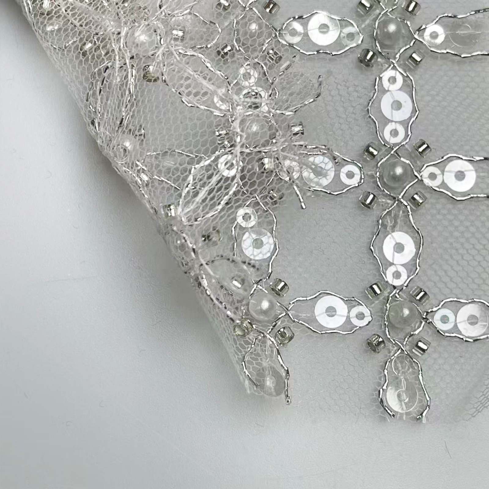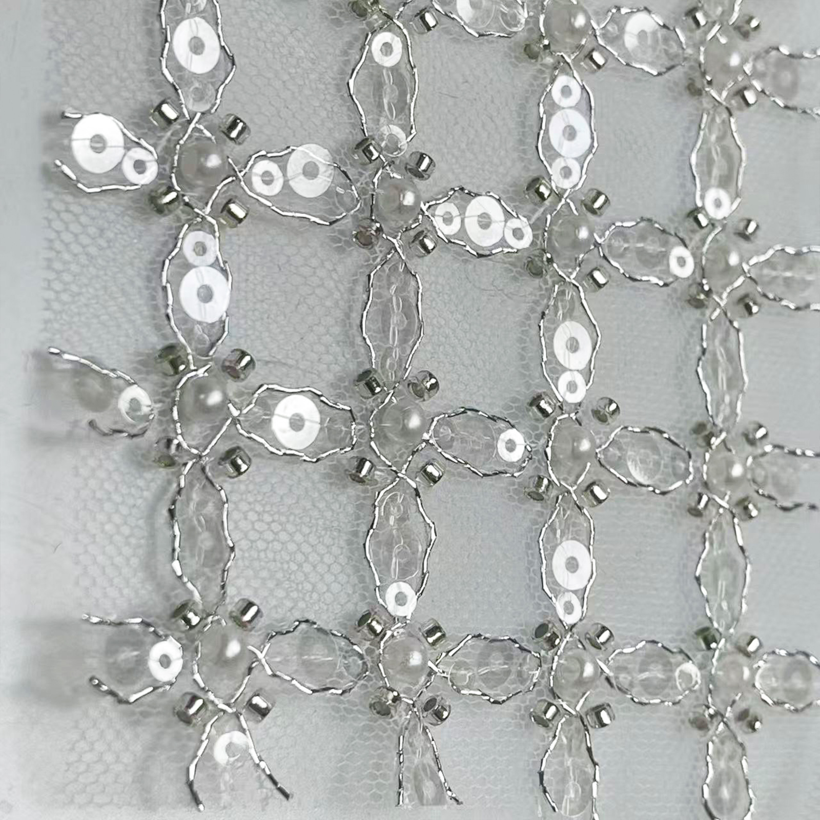 属性:网纱为基底,融合骨绳立体肌理、珍珠圆润质感与管珠、亮片多重缀饰,层次丰富饱满。牢固耐穿。兼具精致立体感与璀璨光泽,适配舞台礼服、轻奢女装及高级定制服饰。