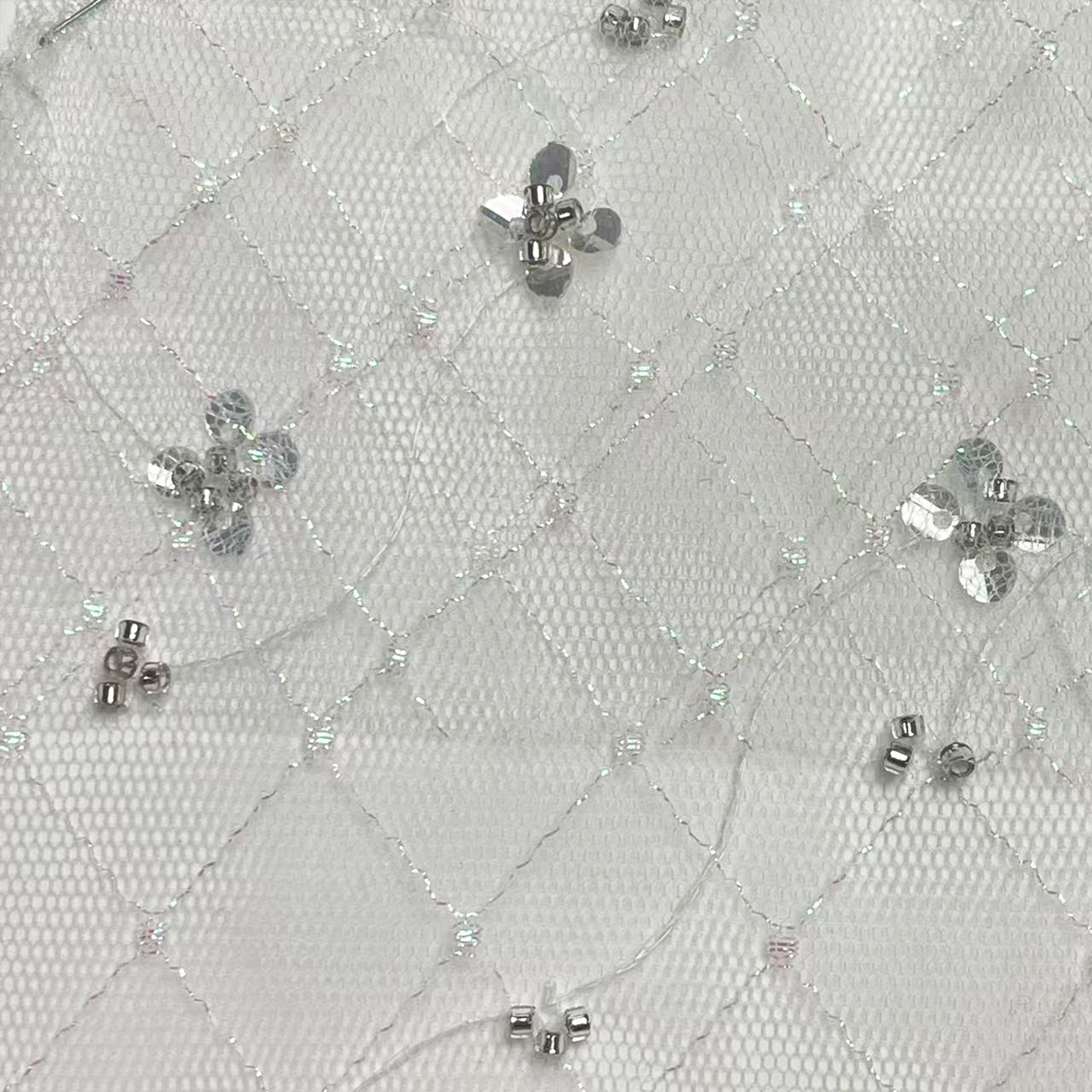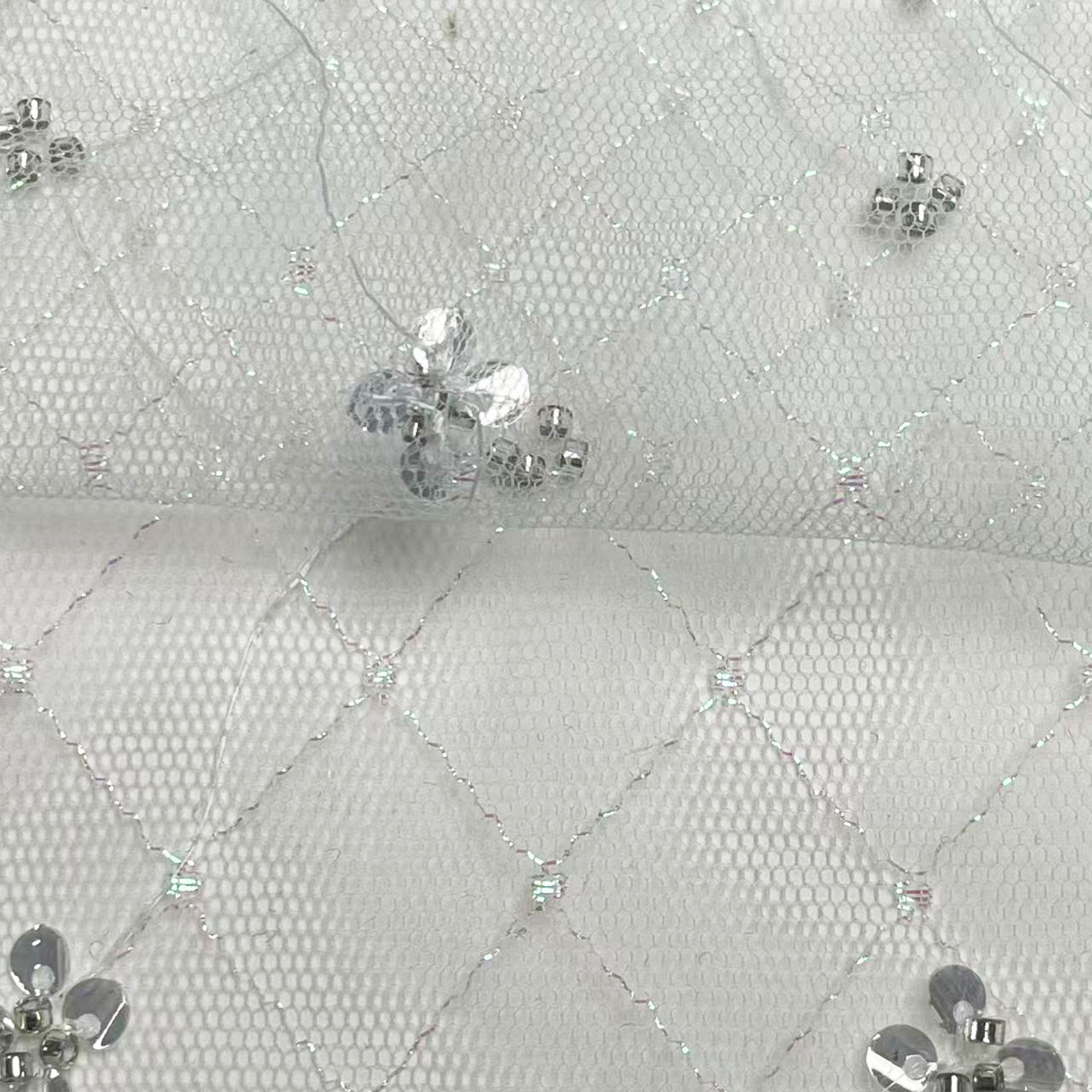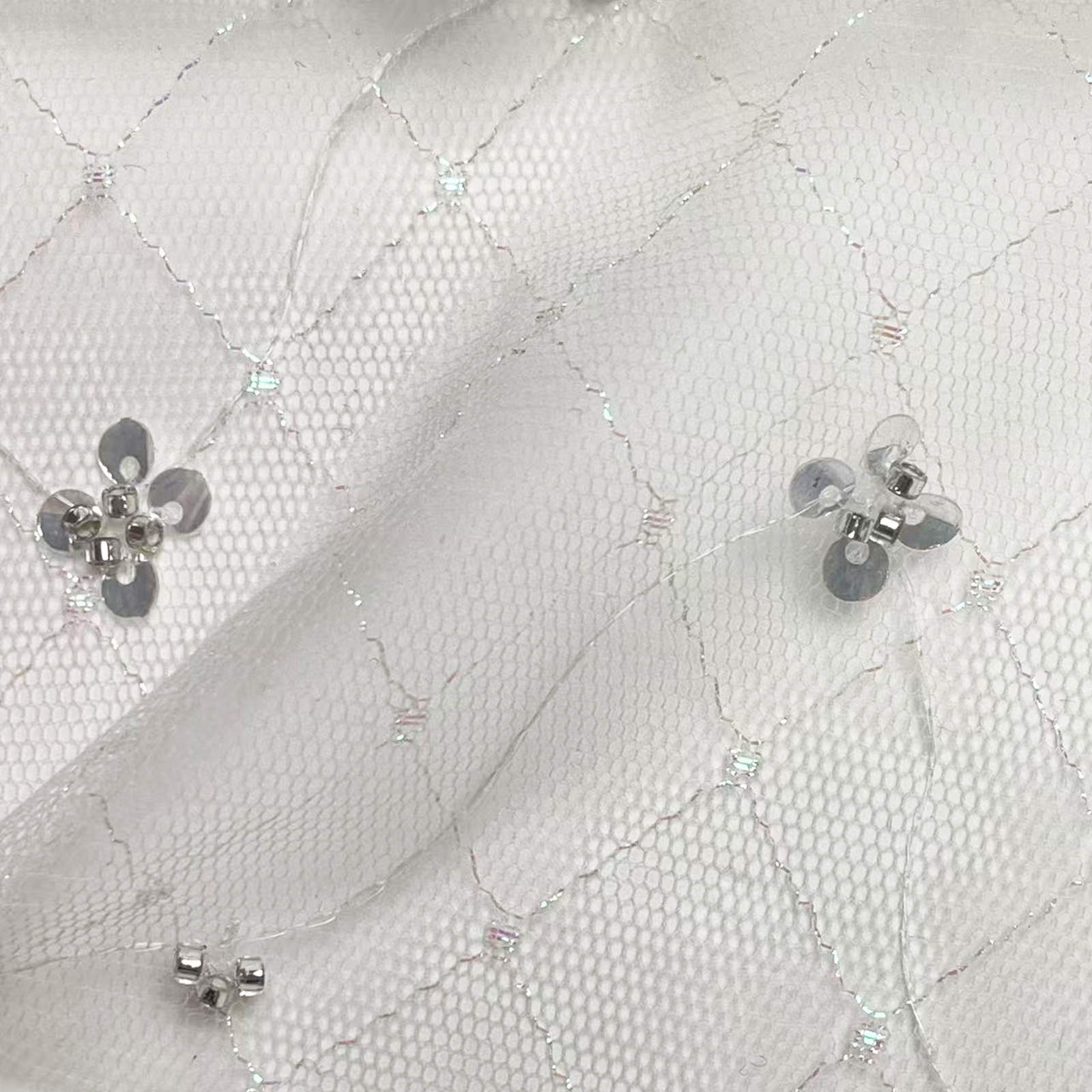 属性:通透网纱为基底,采用镭射线织格子菱形肌理,结合立体花型工艺,缀饰管珠与亮片。面料轻盈透气,流光灵动,珠片附着牢固,层次立体精致,光泽璀璨华丽,适用于舞台演出服、礼服及轻奢女装制作。