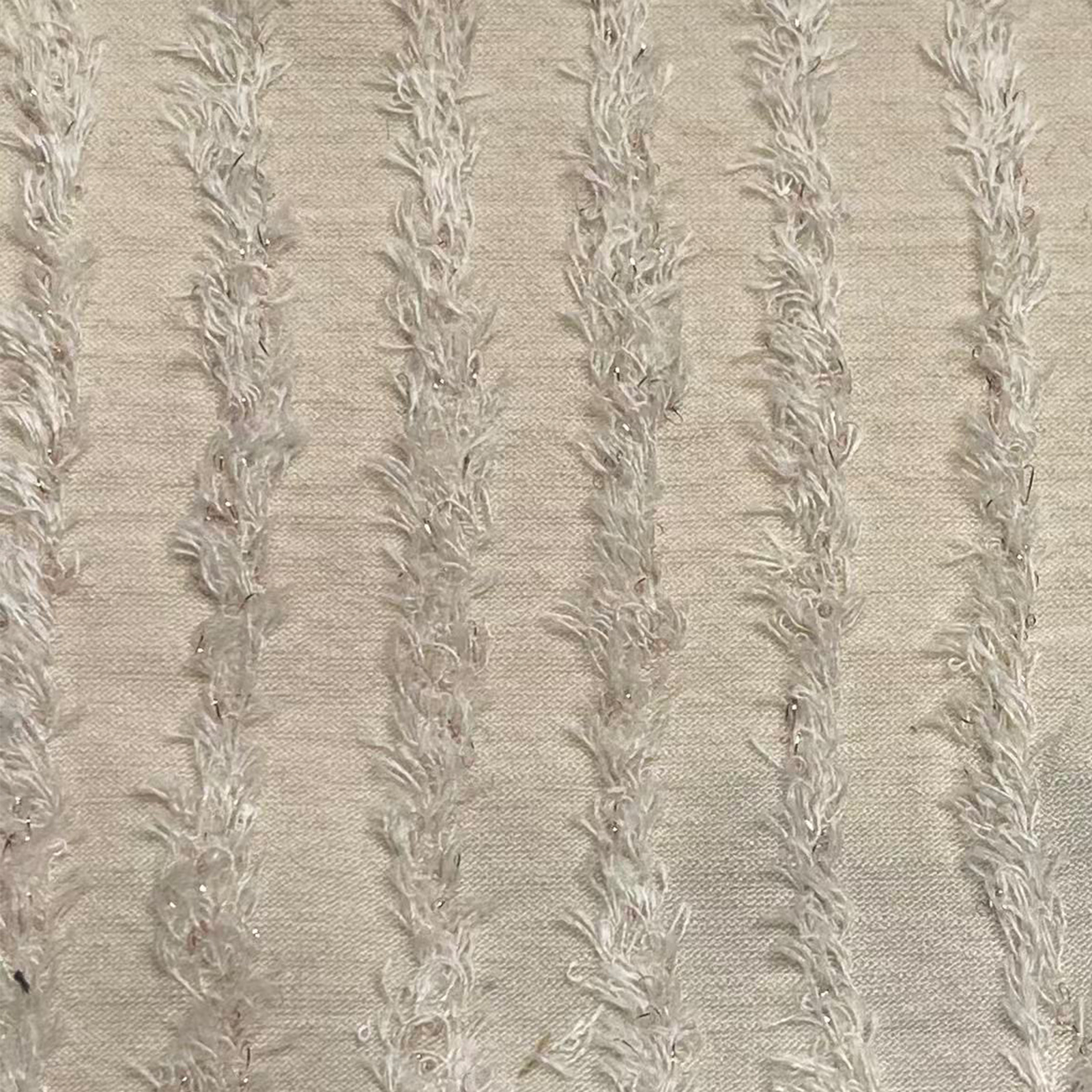 属性:采用立体剪毛工艺形成蓬松立体肌理,融入金线闪丝织造,搭配流苏设计。面料触感柔软蓬松,肌理饱满有层次,金线闪丝流光灵动,流苏垂坠飘逸。光泽炫丽吸睛。
