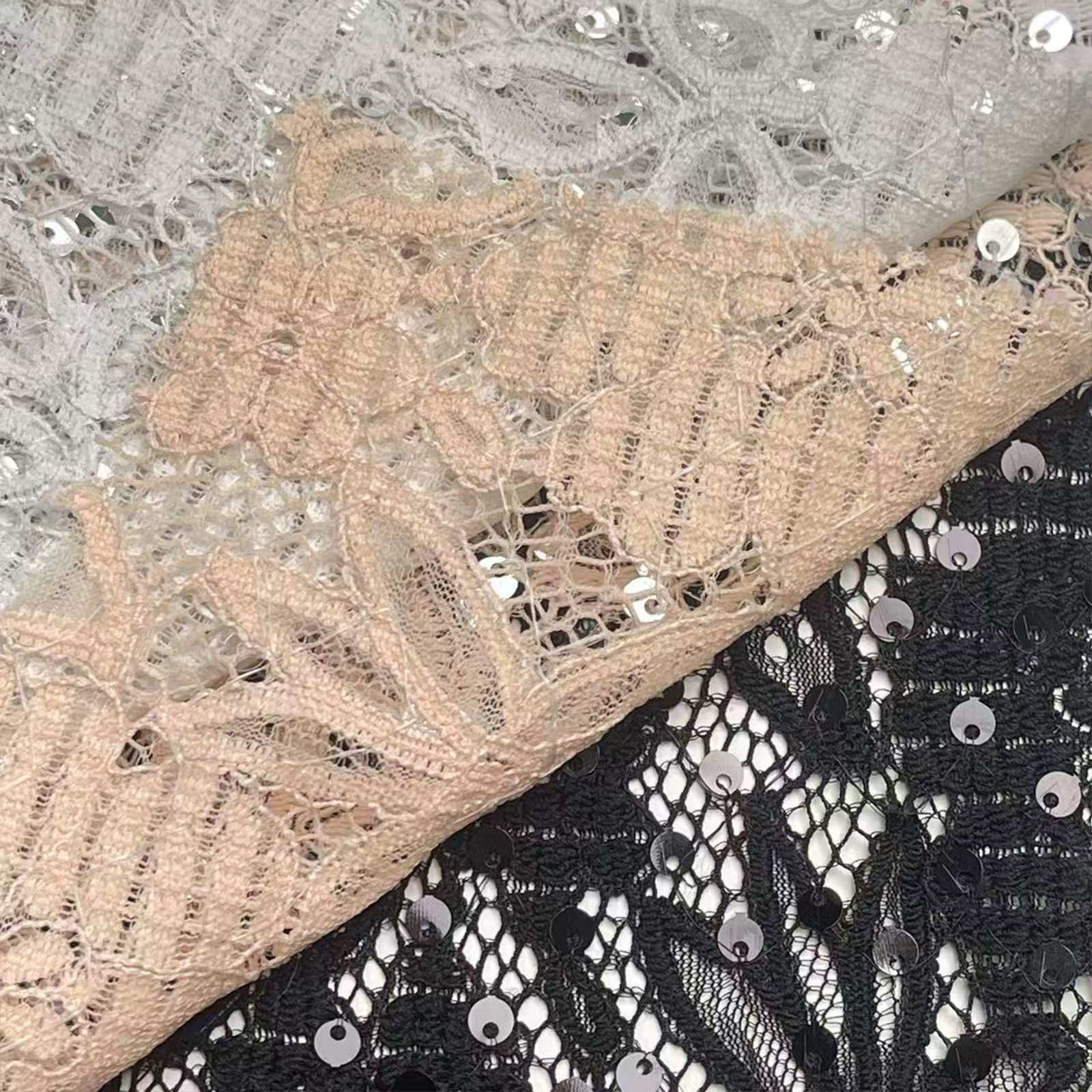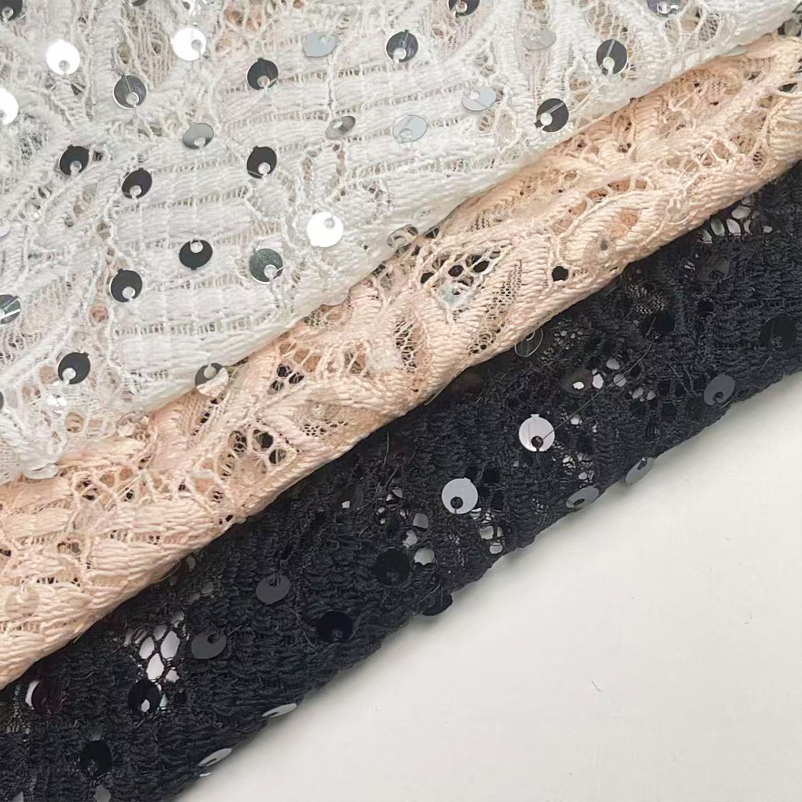 属性:精美提花工艺与亮片绣装饰,花纹雅致,肌理细腻通透。面料轻盈柔软、透气性佳,亮片附着牢固,光泽璀璨灵动。