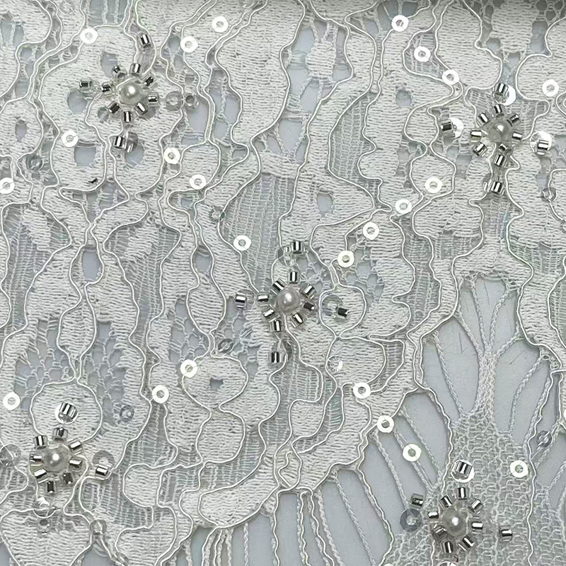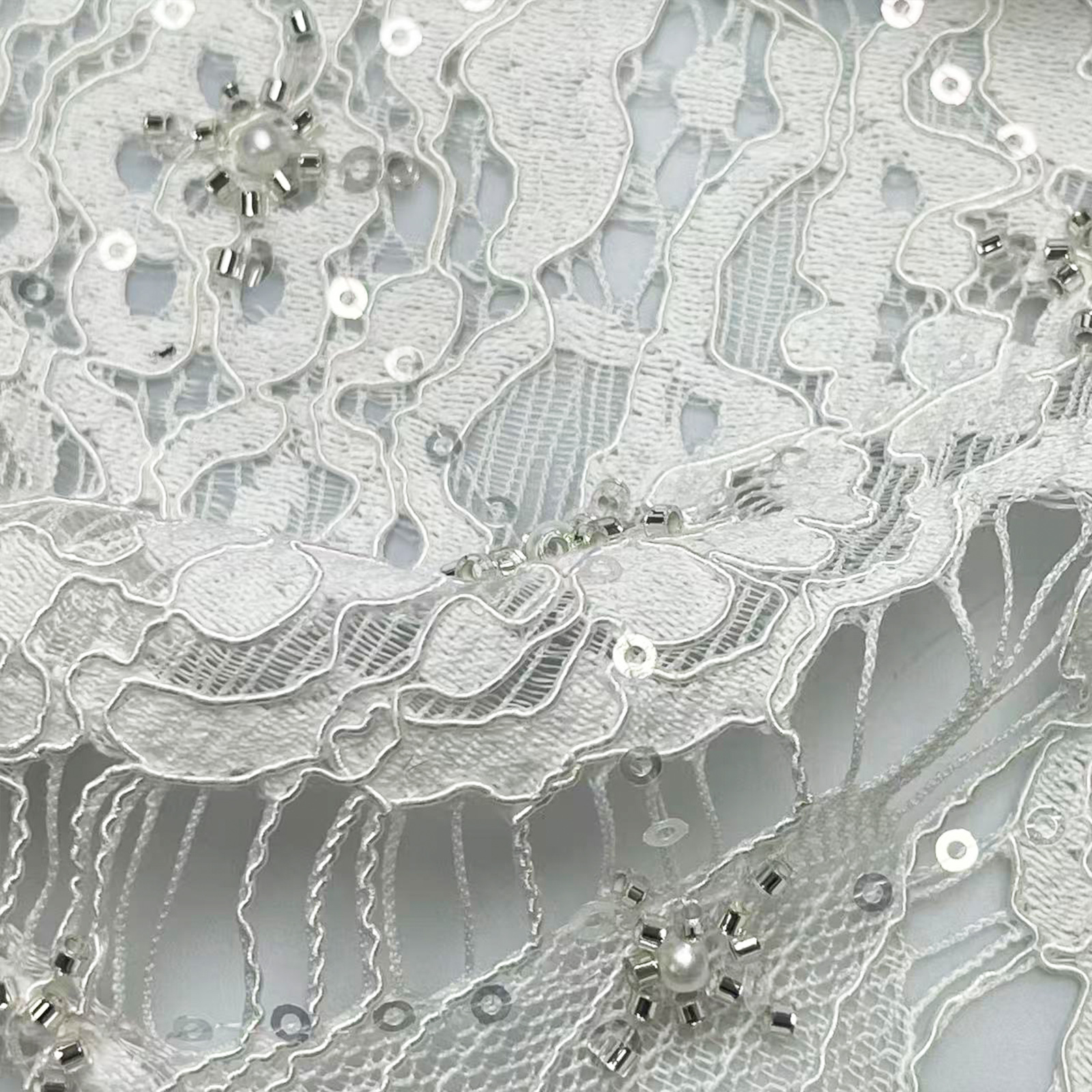 属性:宽股线精工织造,面料挺括有质感,柔软透气,管珠牢固立体,精致华丽,适用于婚纱礼服、轻奢女装、舞台演出服及高端定制服饰。