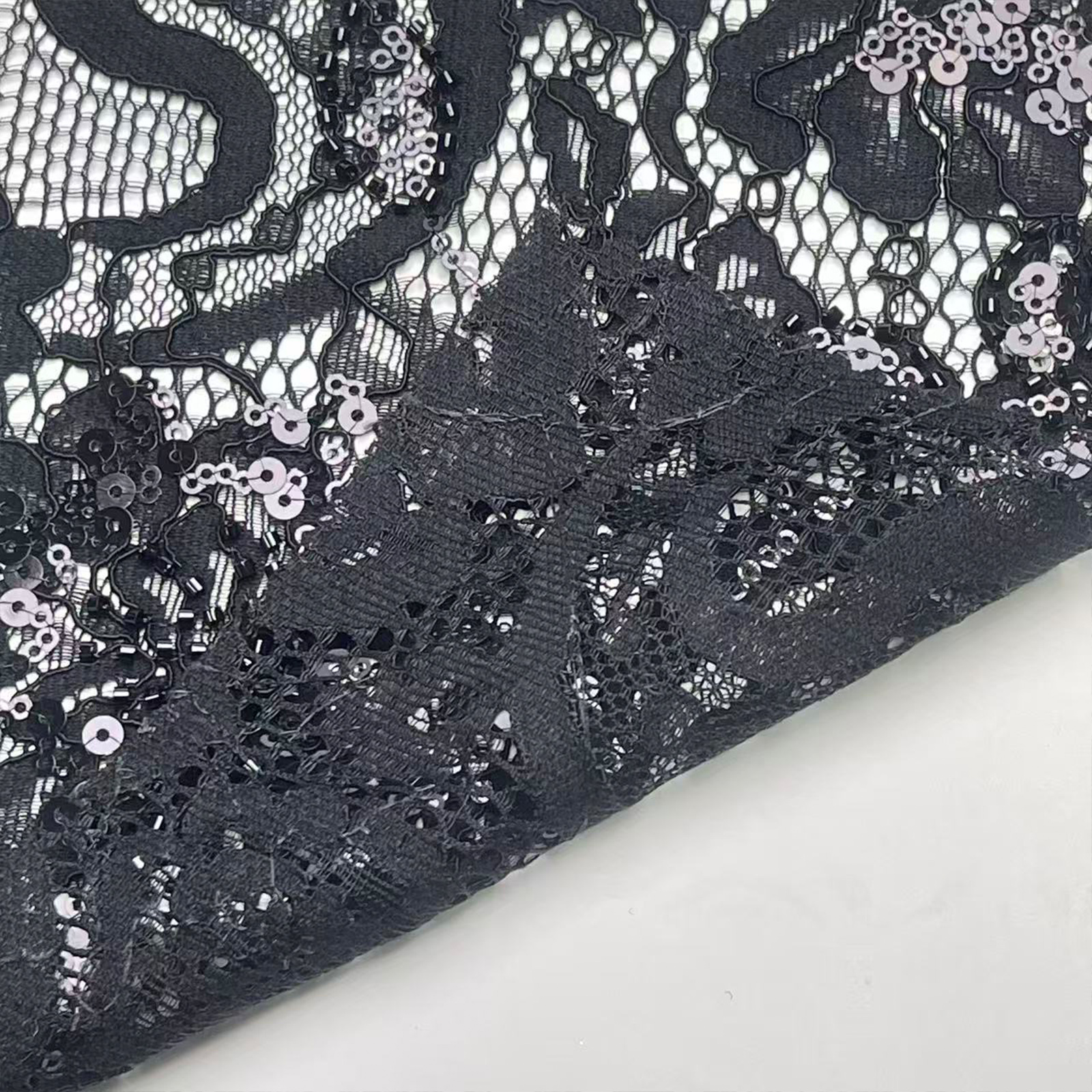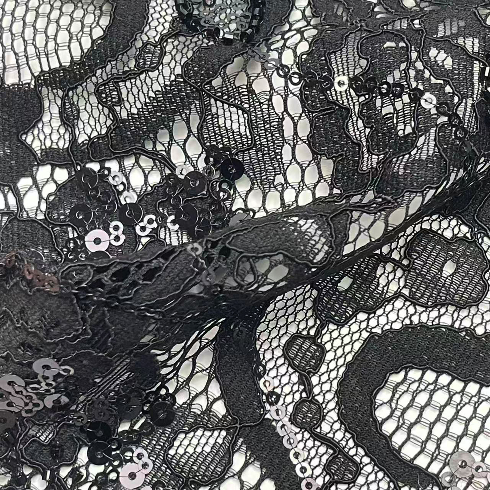 属性:立体股线精工编织蕾丝基底,搭配精致管珠刺绣工艺,花型饱满立体、肌理挺括细腻。面料柔软亲肤、透气舒适,管珠牢固闪耀,层次丰富轻奢有质感。