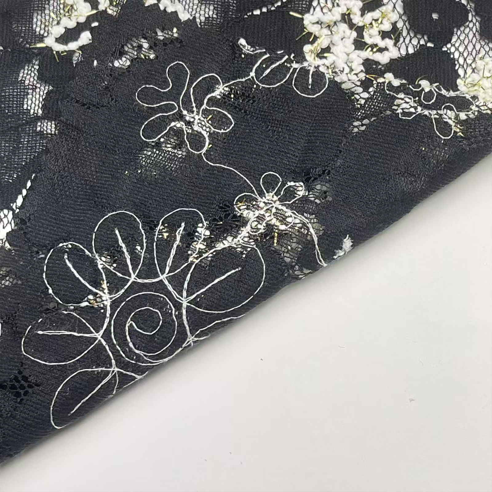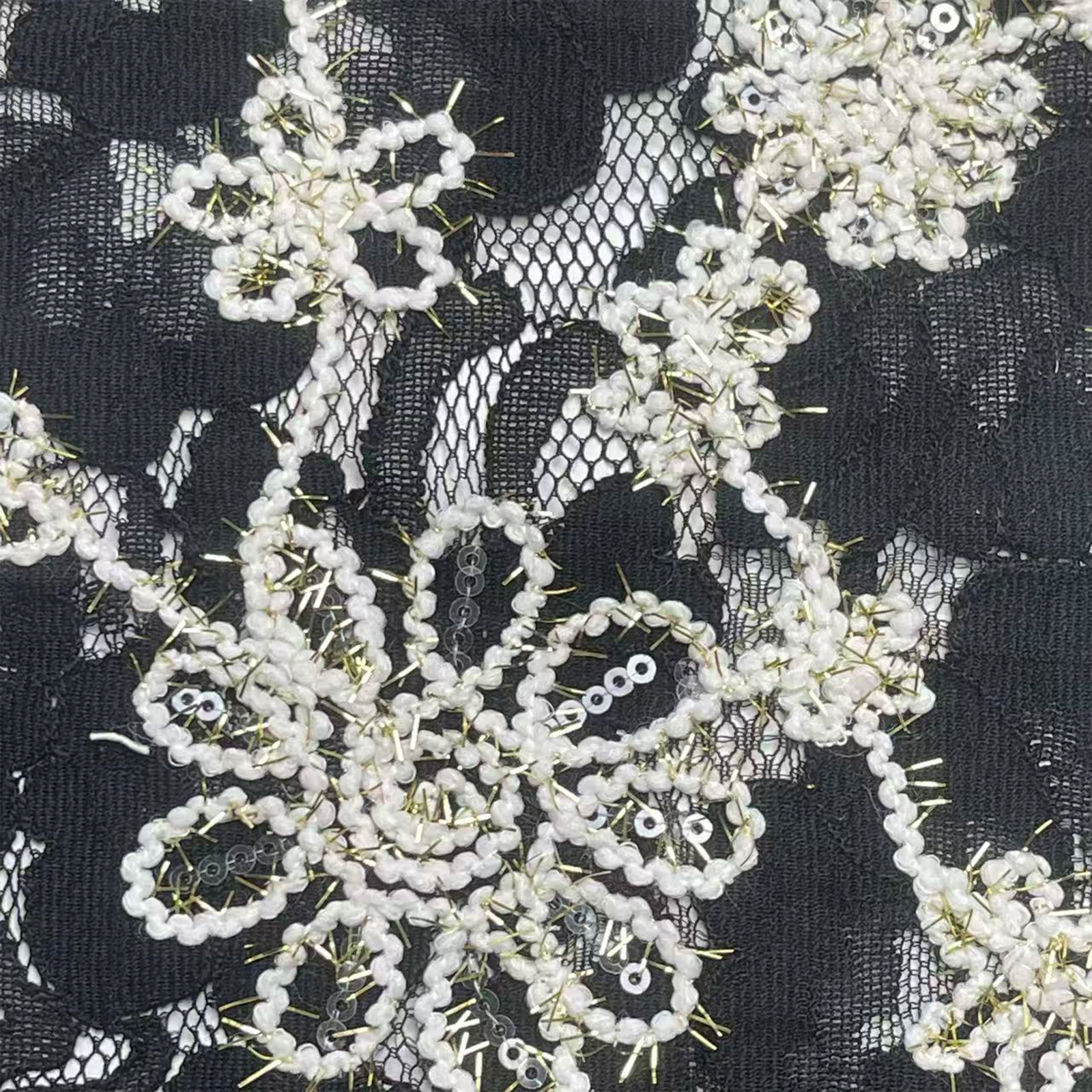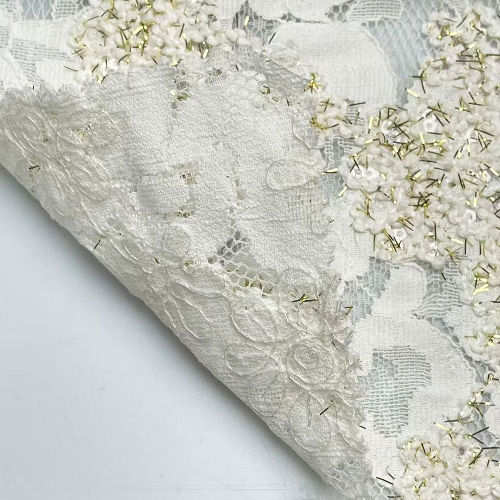 属性:蕾丝提花基底,金线打籽绣工艺;立体颗粒肌理饱满精致,金线光泽璀璨亮眼,提花纹理细腻雅致,面料通透轻盈、柔软透气,质感轻奢华丽。