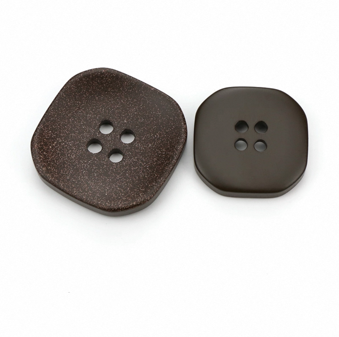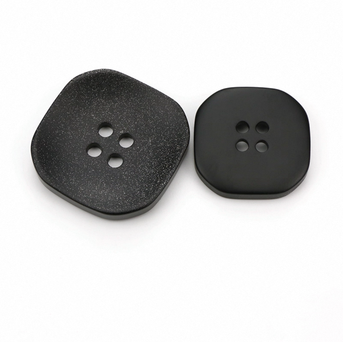 属性:这款四方形磨砂树脂钮扣,酷黑主调尽显低调质感。一面似洒落细碎星光,为衣物添一抹神秘灵动;一面简约纯粹,流露利落大气。四孔设计稳固实用,无论是商务正装还是休闲潮搭,它们都能精准拿捏风格,成为穿搭中的点睛之笔。