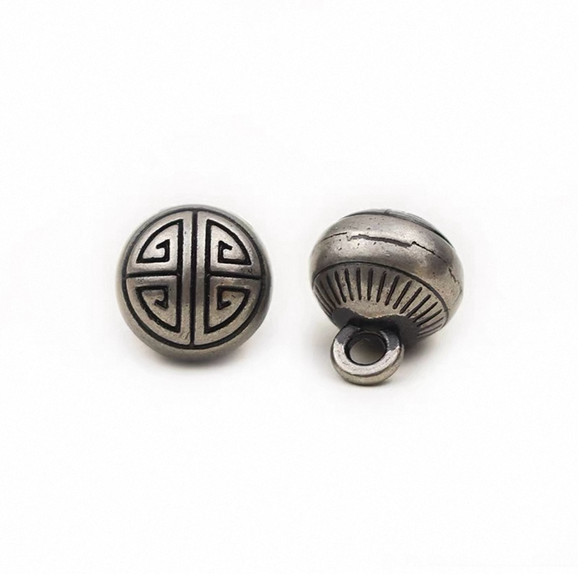 属性:复古做旧金属钮扣,圆形面刻经典回纹,自带岁月包浆。古银色泽沉淀时光韵味,背面小巧挂环藏巧思。中式美学融入细节,为唐装、汉服点睛,扣合间,让传统纹样与现代服饰碰撞,诉说东方古韵 。