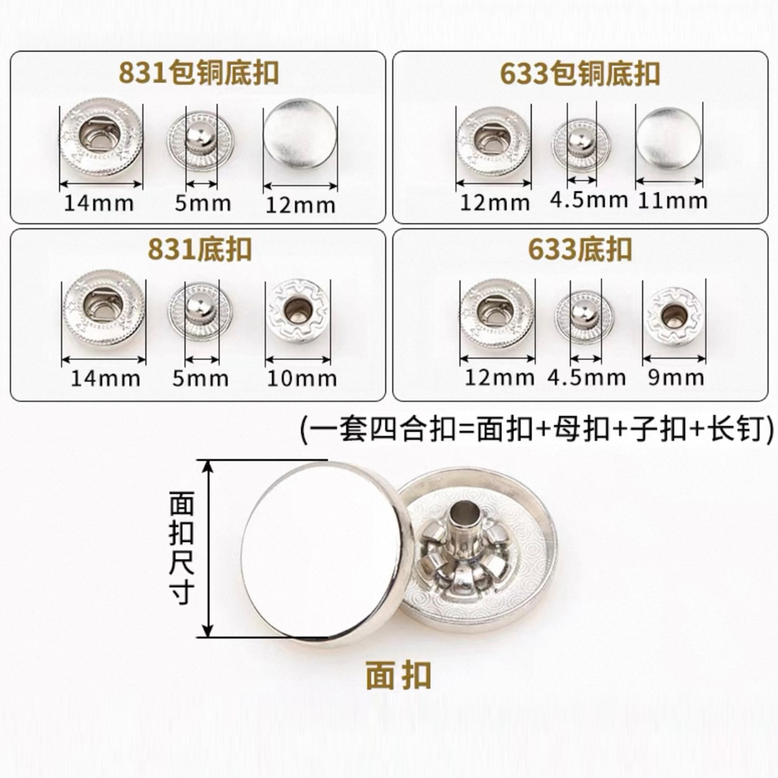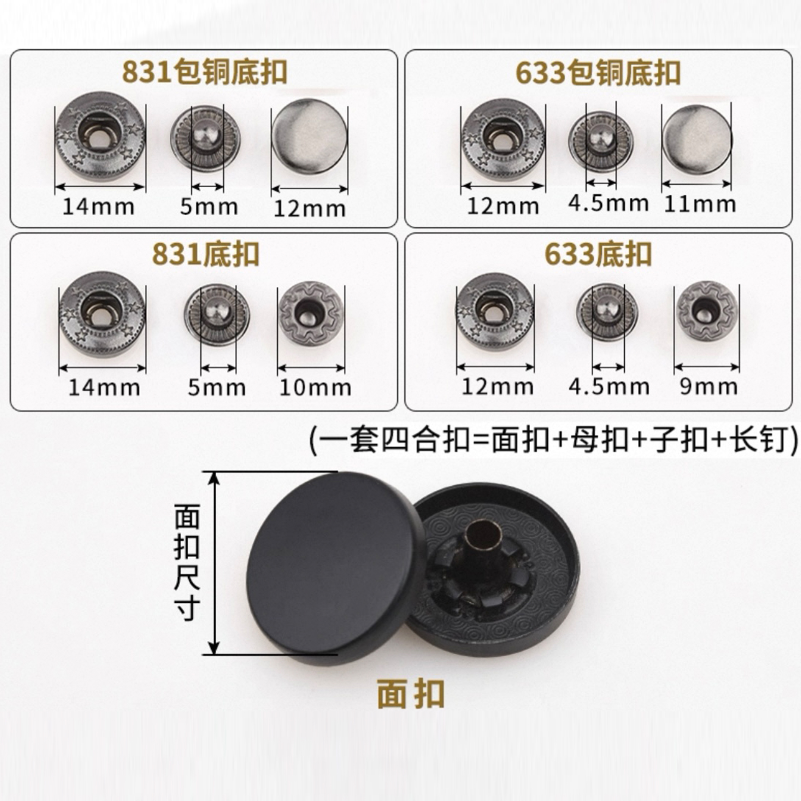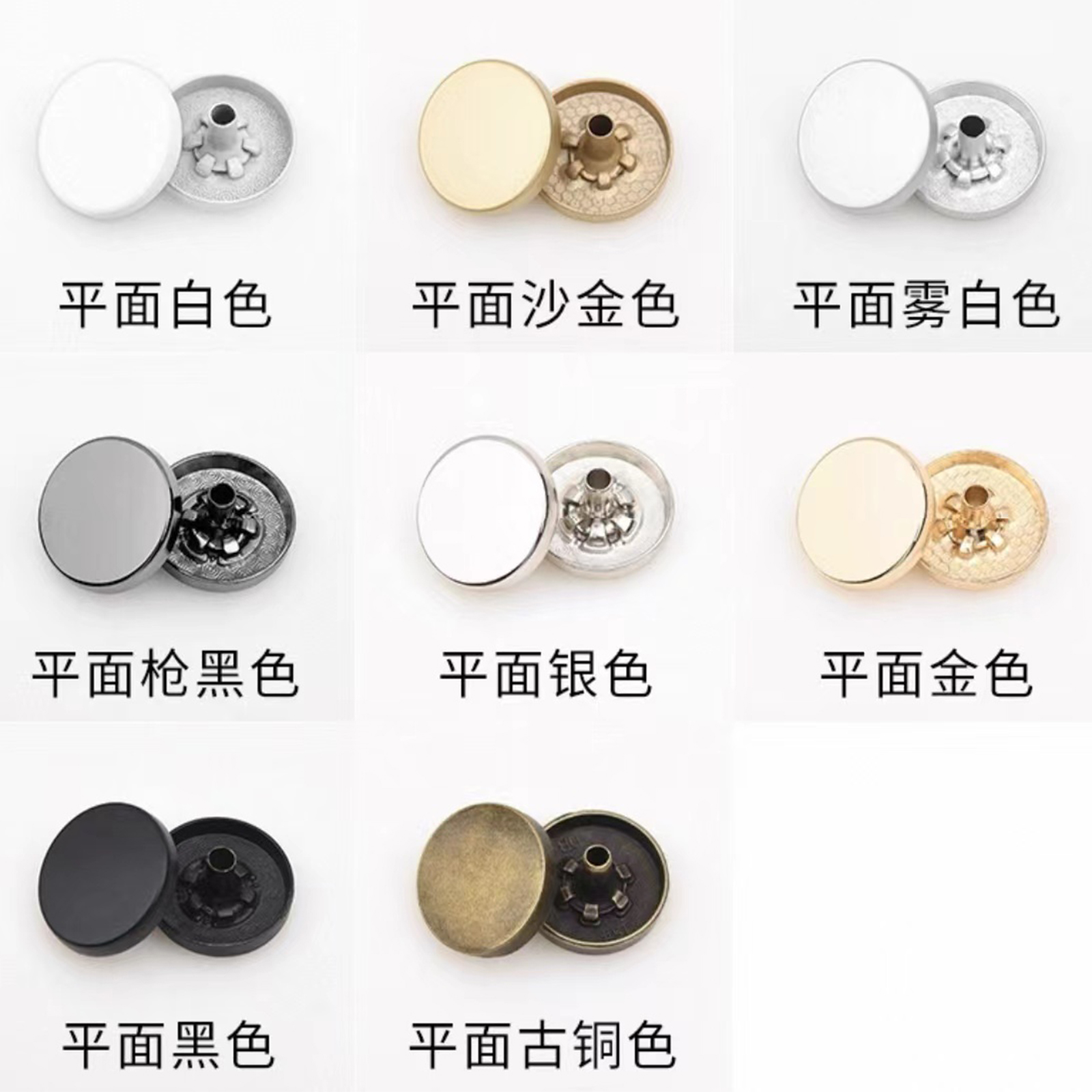 属性:这些平面四合扣,色彩多样,从简约白到复古古铜色,适配不同风格衣物。安装便捷,扣合牢固,为服装增添精致细节,无论是日常穿搭还是手工制衣,都是实用又美观的小配件,轻松提升衣物质感。
