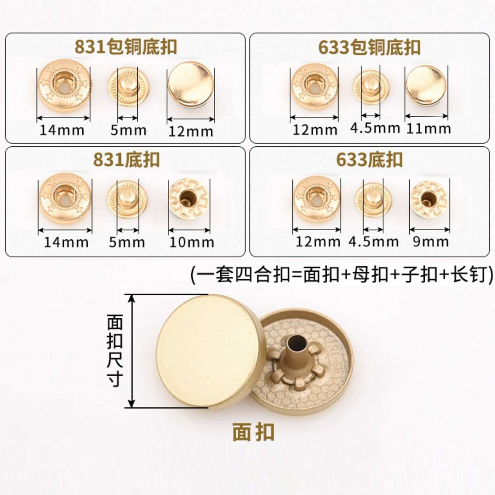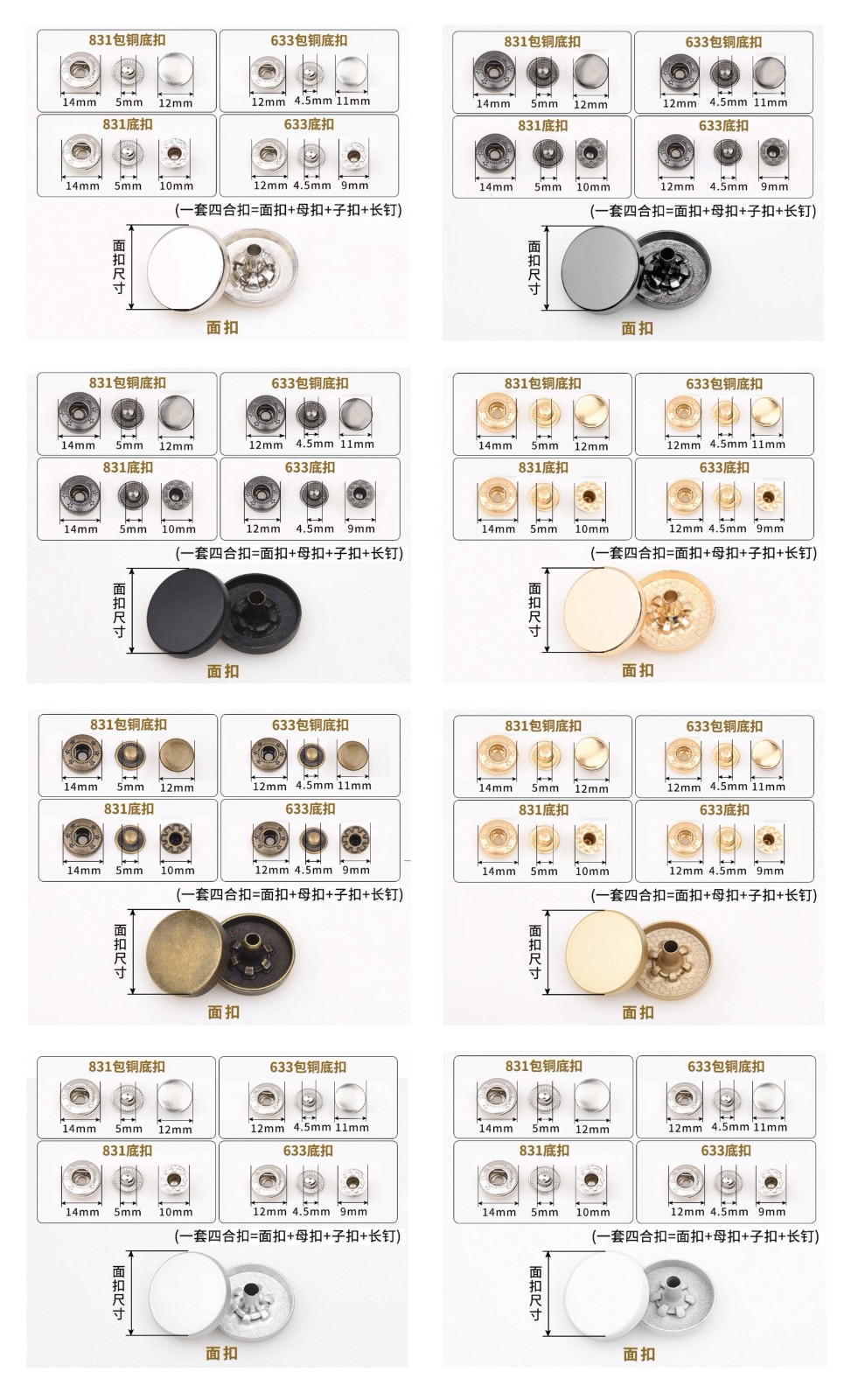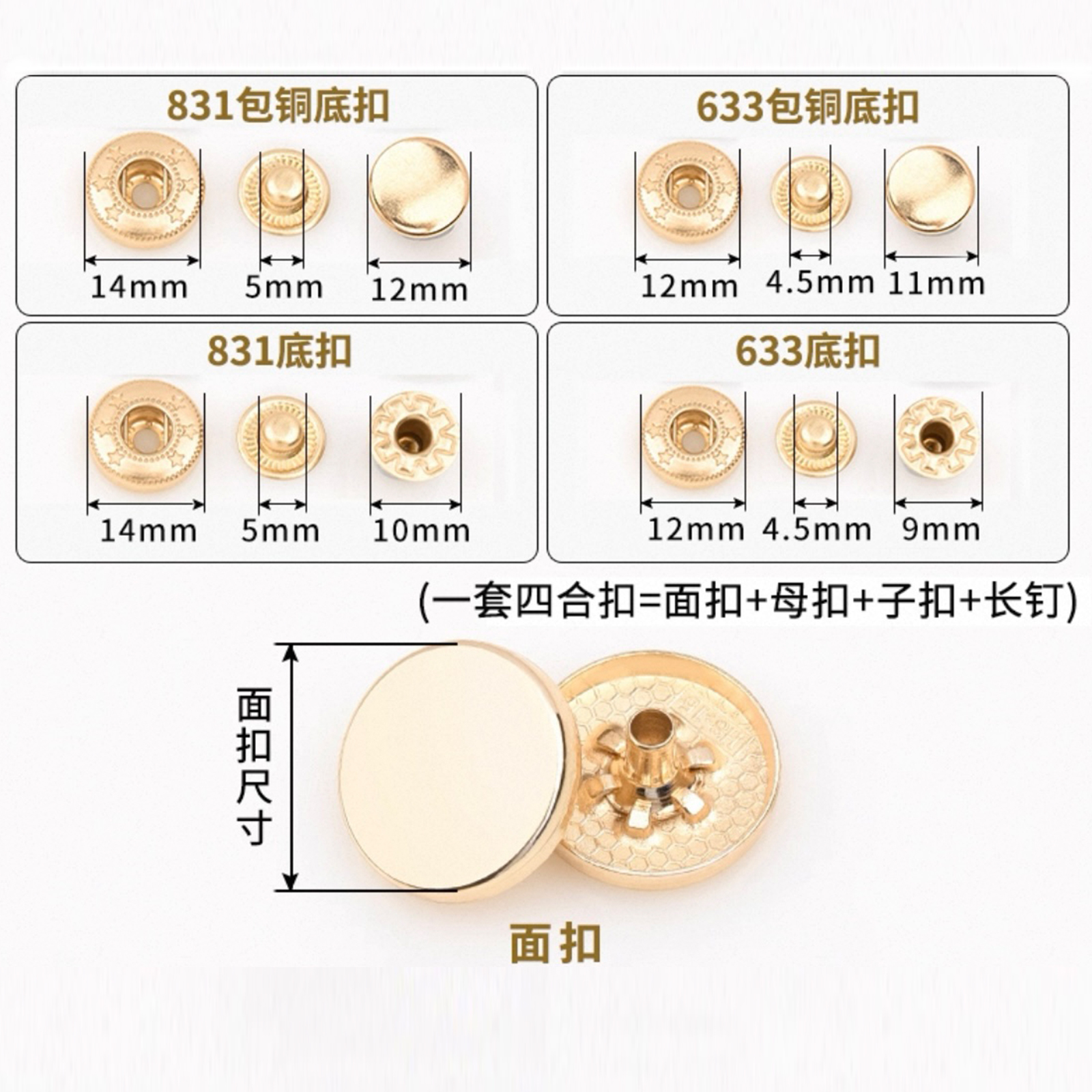 属性:这些平面四合扣,色彩多样,从简约白到复古古铜色,适配不同风格衣物。安装便捷,扣合牢固,为服装增添精致细节,无论是日常穿搭还是手工制衣,都是实用又美观的小配件,轻松提升衣物质感。