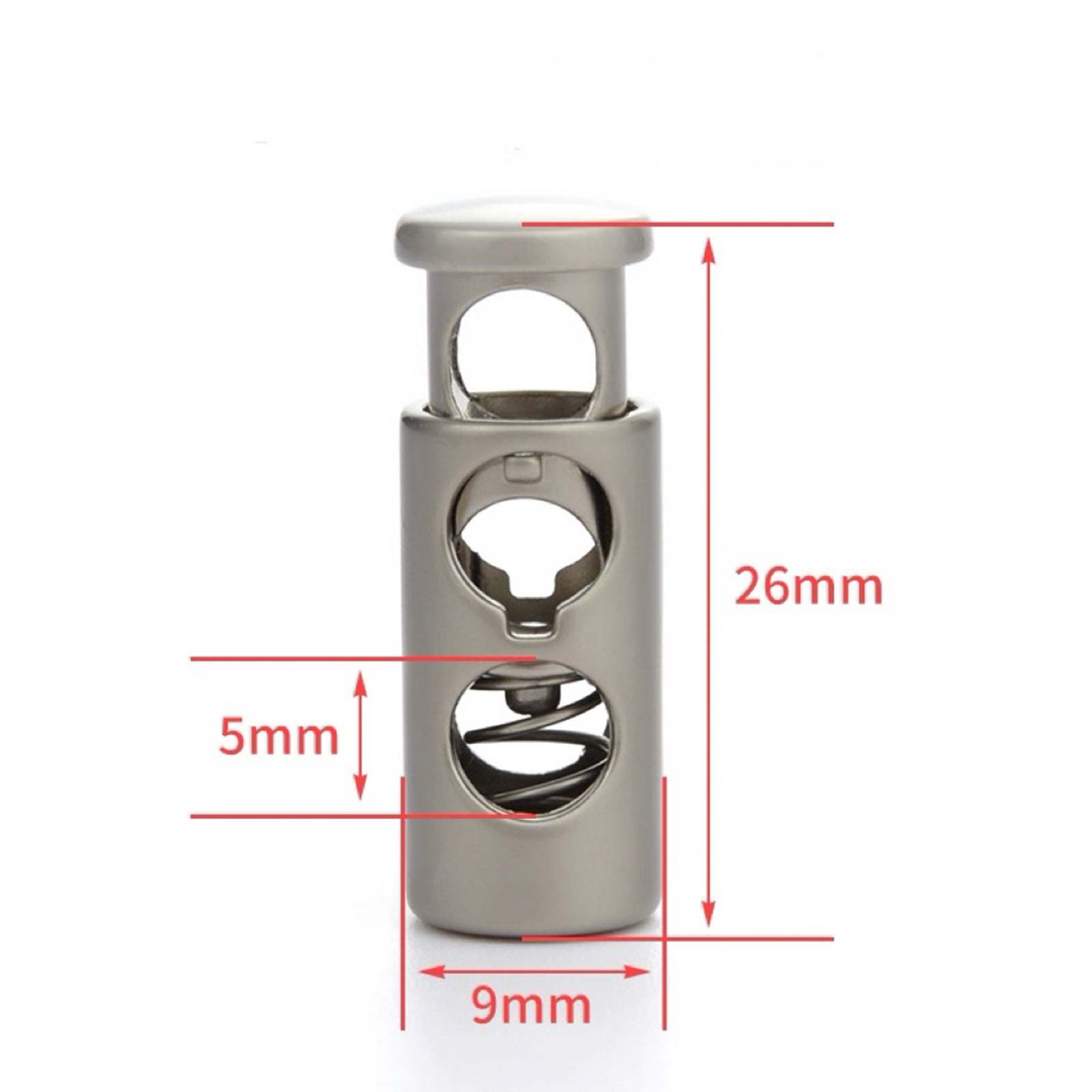 属性:精致金属弹簧扣,尺寸精准:高 26mm、宽 9mm,5mm 细节藏巧思。金属质感高级,弹簧结构灵活耐用,轻松调节绳带松紧,适配衣帽、箱包,为物件注入实用美学,小配件也有大精彩。