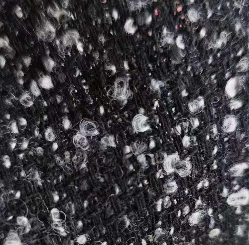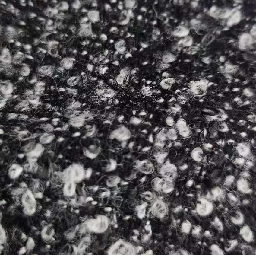 属性:羊毛赋予面料天然保暖性与柔软亲肤的触感,涤纶则增强面料挺括度与耐穿性,减少起球变形,兼顾天然质感与实用性能。黑灰撞色交织出立体饱满的圈圈肌理,自带复古慵懒氛围,视觉层次丰富且极具设计感。