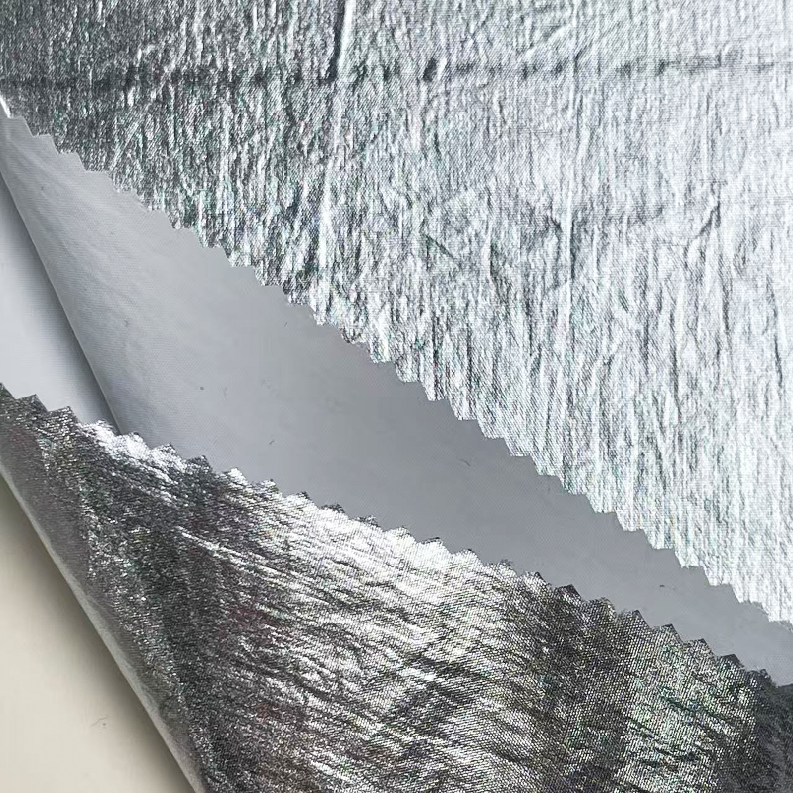 属性:采用防水尼龙皱基底,叠加水洗烫金与烫金工艺,呈现浓郁金属光泽。肌理自然立体,柔韧轻薄,防风防水,耐磨耐水洗,烫金附着牢固。兼具舞台炫丽质感与羽绒服实用功能,适配演出服、舞台装及保暖羽绒服饰。