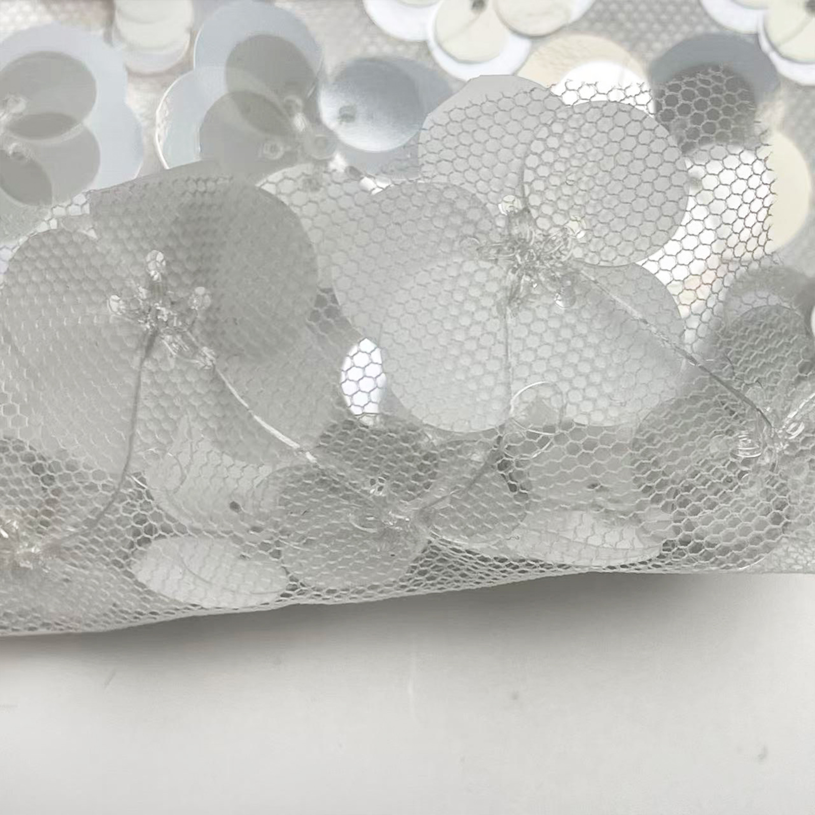 属性:柔透网纱为基底,缀满大尺寸圆亮片,交织绒感花骨朵肌理。触感轻盈蓬松,网眼通透透气,珠片与花型错落有致,光泽灵动闪耀。