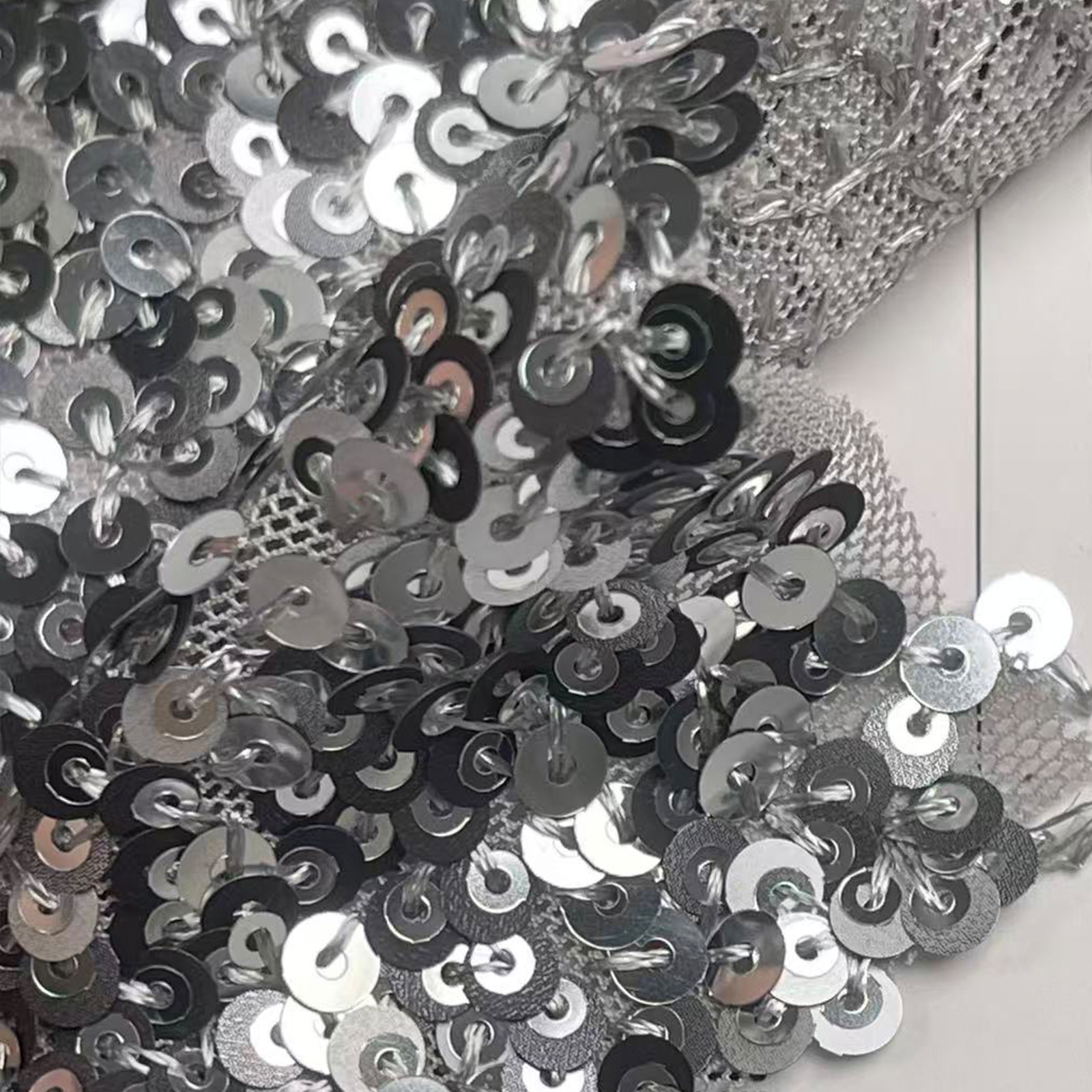 属性:以高弹网布为基底,采用珠片绣工艺缀满亮片,兼具弹性与垂坠感。面料柔软亲肤,拉伸回弹性能优异,透气不闷身,珠片排布规整且牢固。