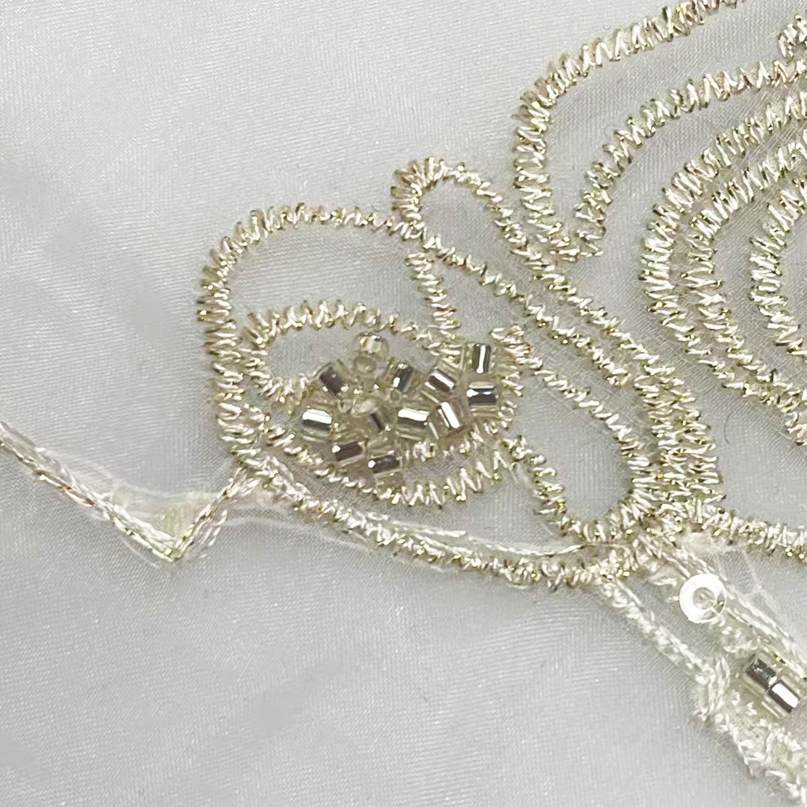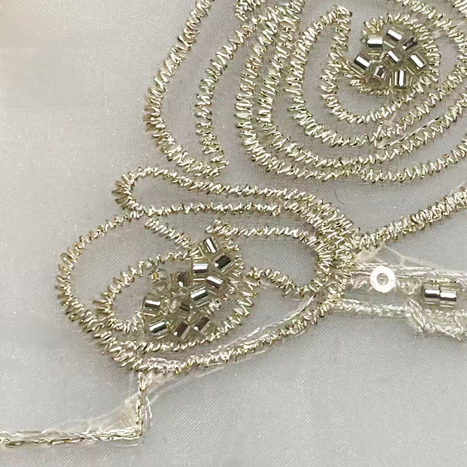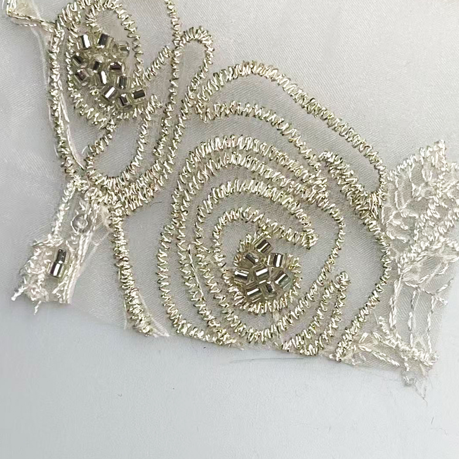 属性:网布为基底,搭载精美刺绣提花工艺,搭配管珠立体缀饰,肌理层次丰富立体。面料通透轻盈、透气亲肤,提花纹理细腻,珠饰附着牢固。质感轻奢华丽,光泽璀璨雅致。