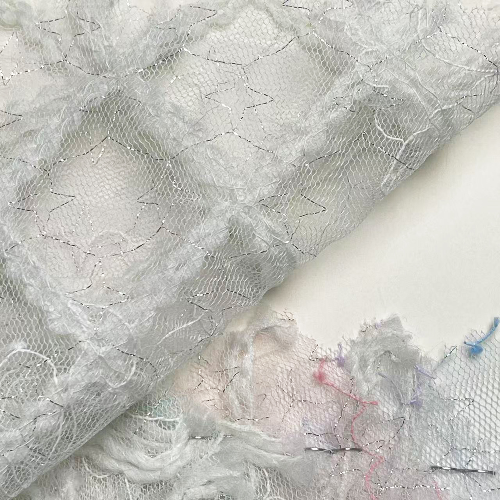 属性:面料通透轻盈,银丝流光闪耀,质感轻奢亮眼。垂感柔和,亲肤舒适,适用于舞台演出服、礼服、轻奢女装及时尚配饰制作。