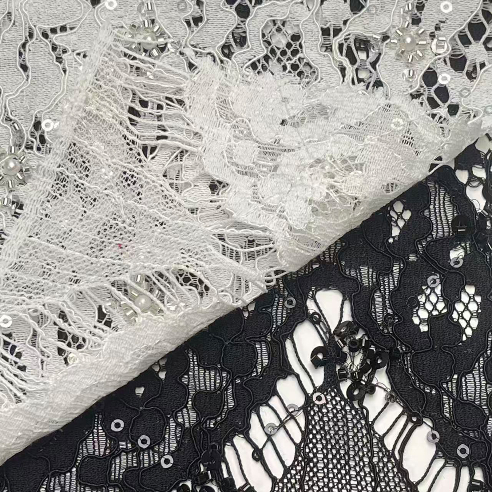 属性:宽股线精工织造,面料挺括有质感,柔软透气,管珠牢固立体,精致华丽,适用于婚纱礼服、轻奢女装、舞台演出服及高端定制服饰。